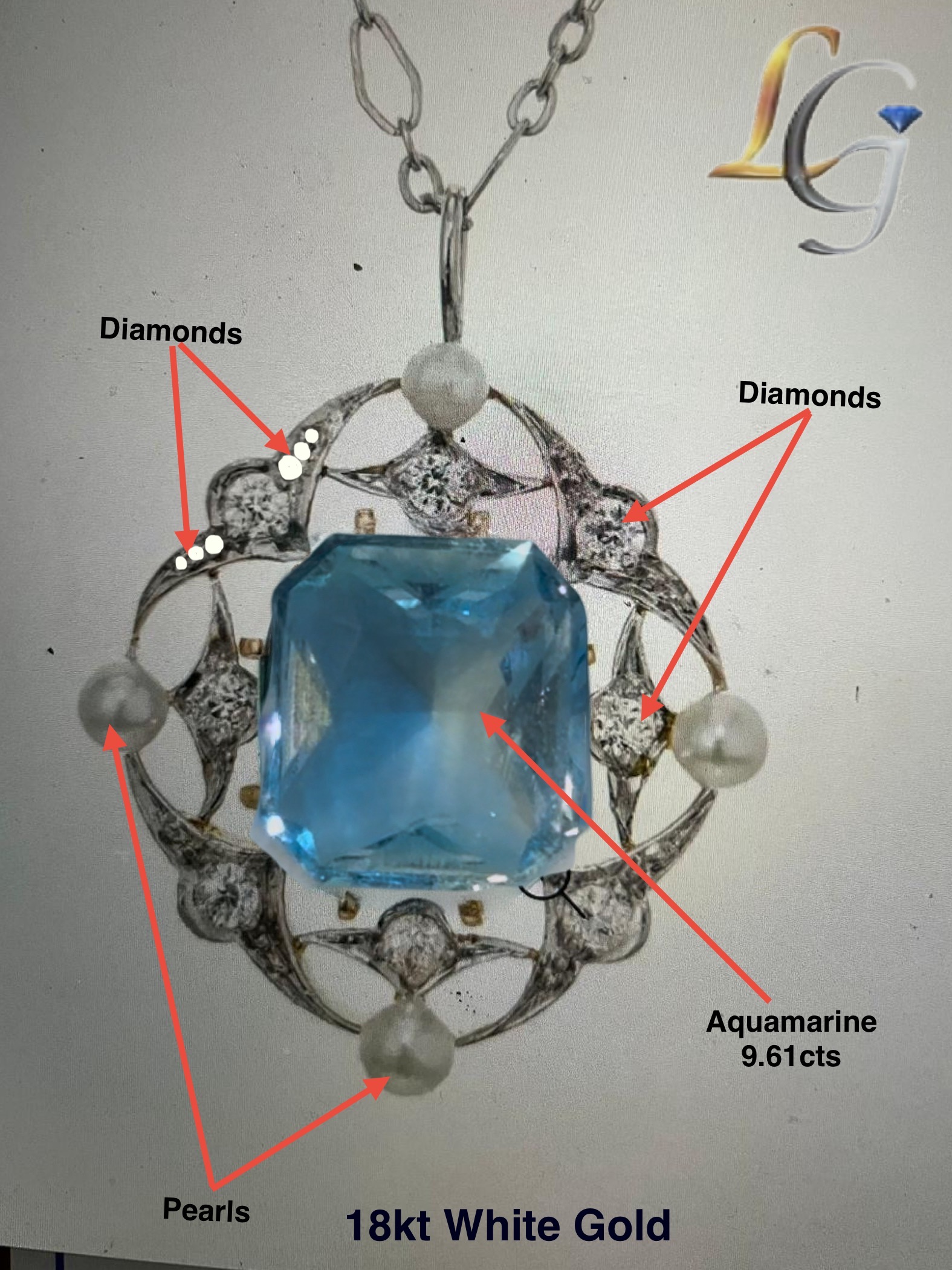 White Gold Pendant custom made to order using Natural Aquamarine, Diamonds and Pearls.