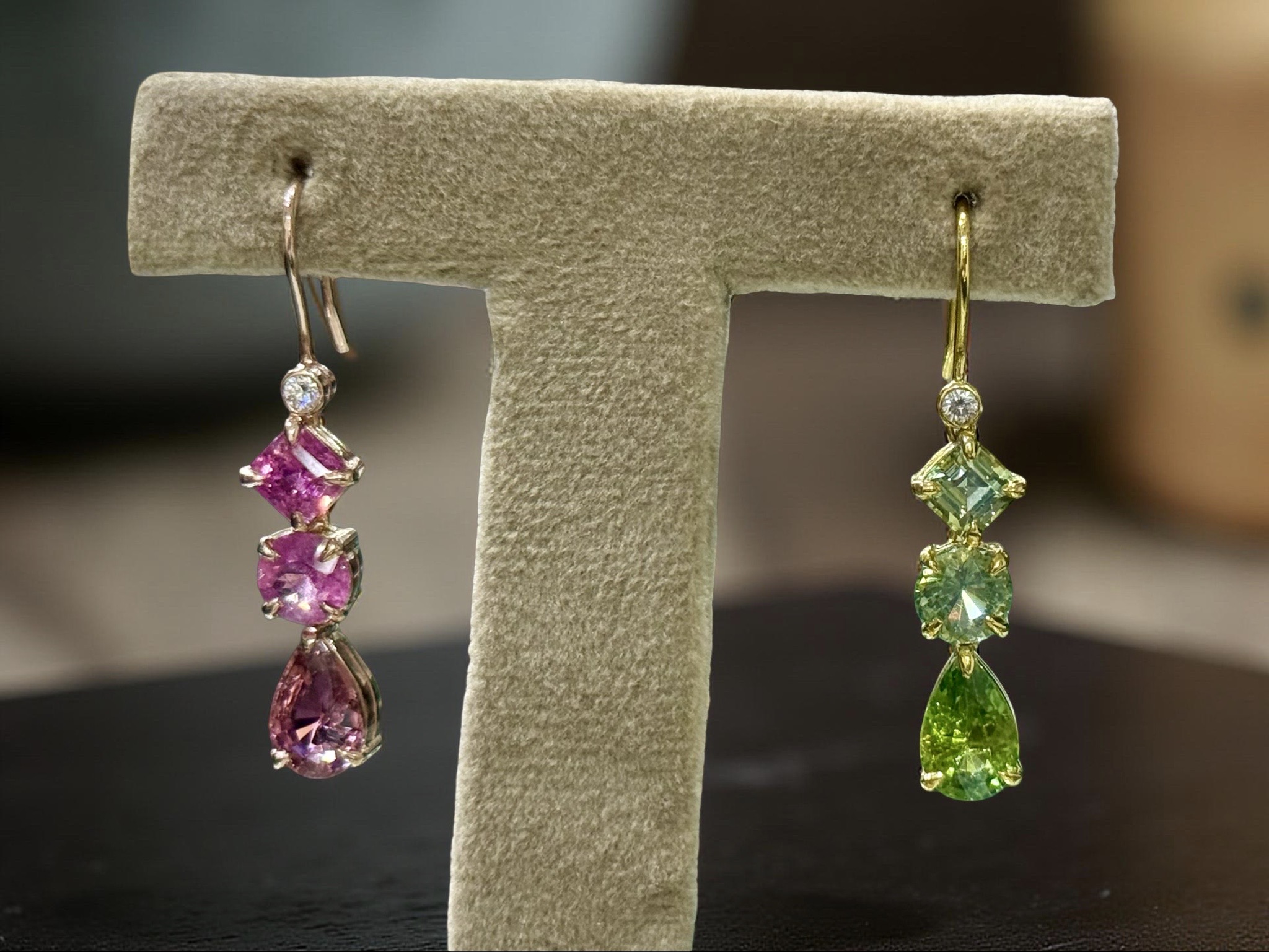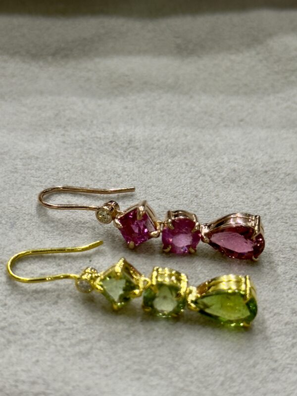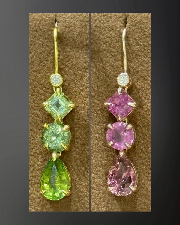 A striking pair of gold earrings featuring pink tourmalines in rose gold and green tourmalines in yellow gold, highlighted with two brilliant diamonds. A perfect harmony of colour and elegance