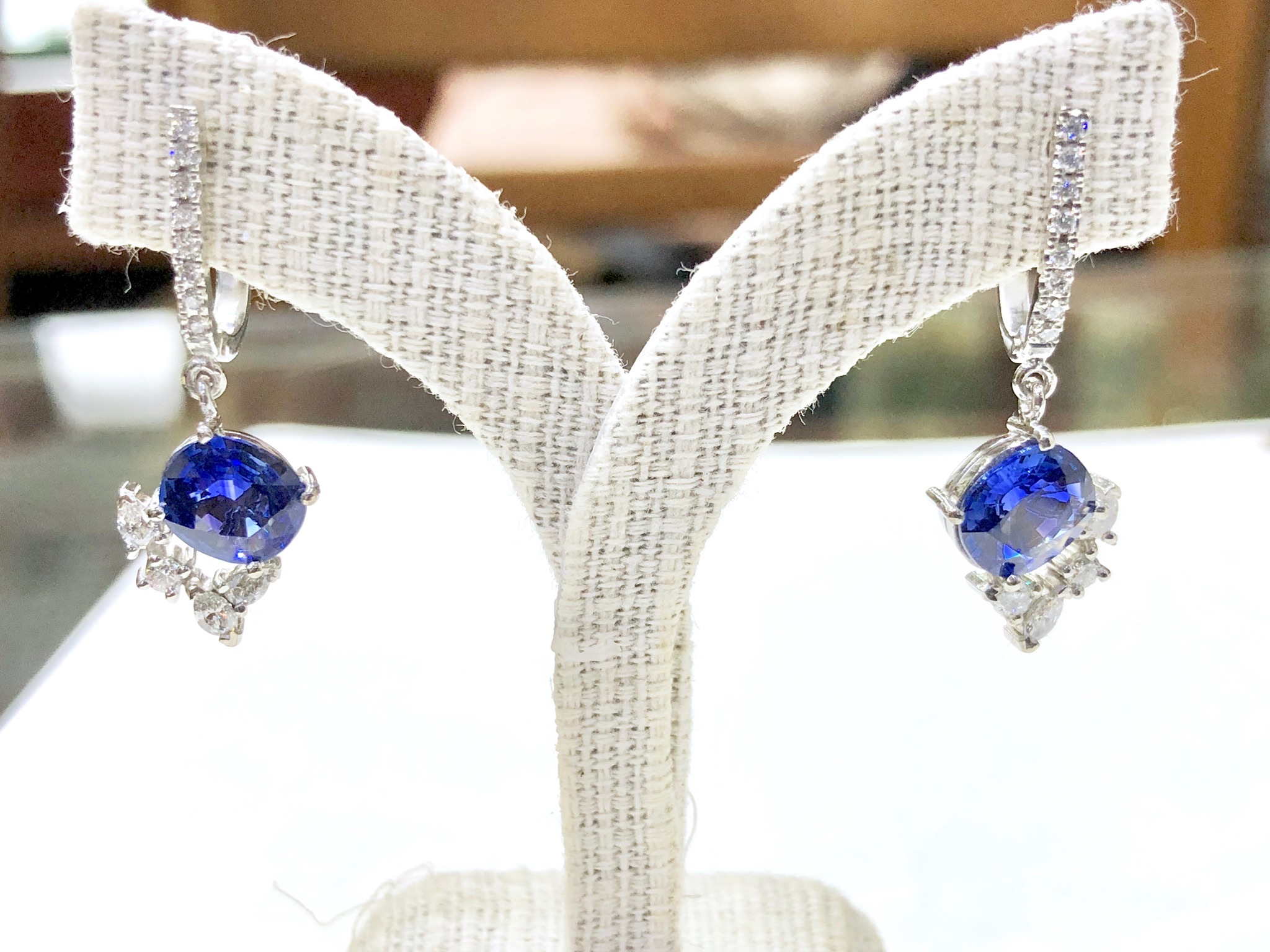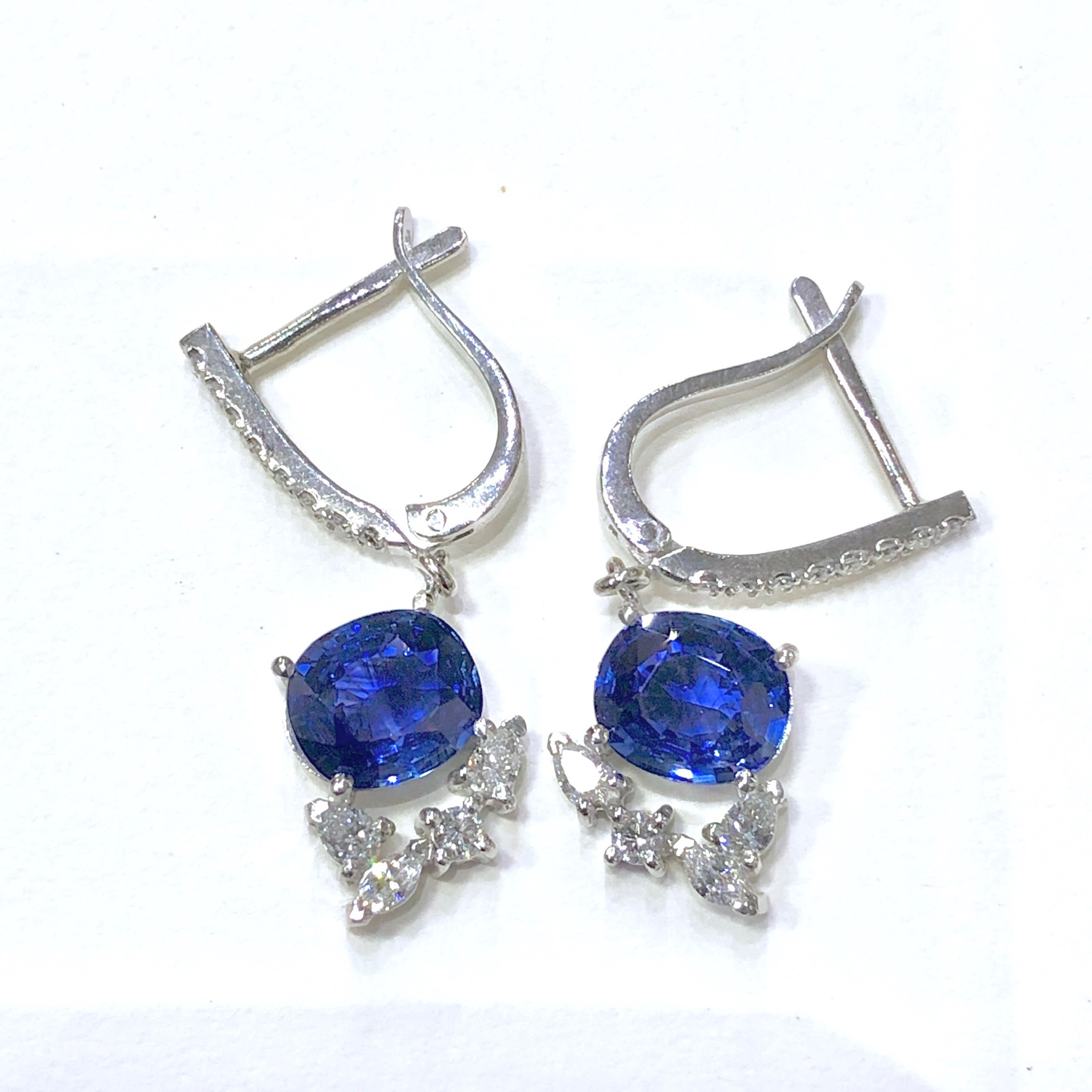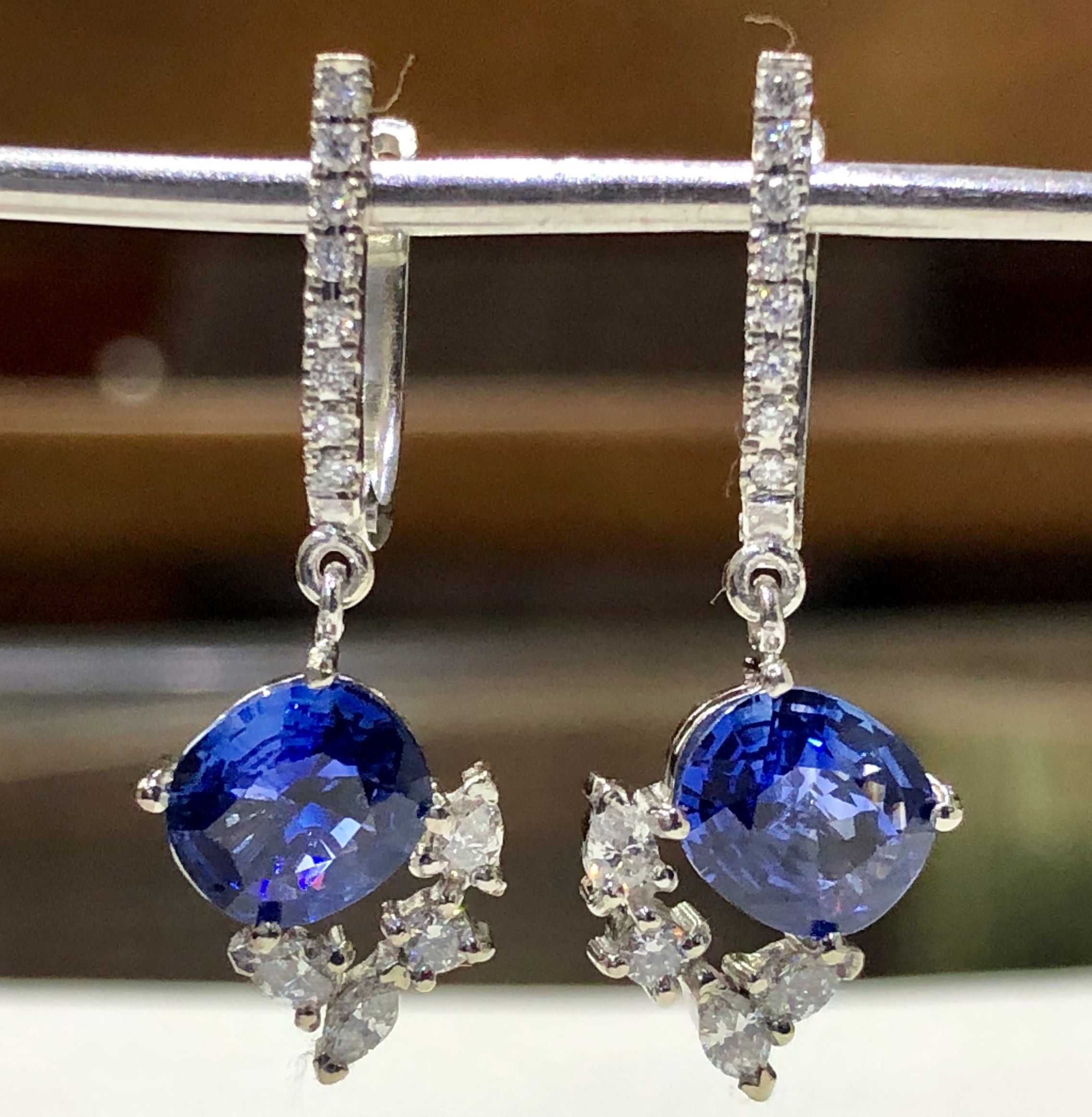 Beautiful Ceylon Sapphires matched pair selected and set in a unique diamond design using white gold.