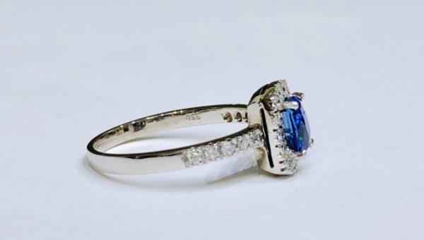 The Blue Sapphire is set in a Micro – Pave halo setting with 17 round brilliant Diamonds around the main stone and 5 round brilliant diamonds on each side of the band.