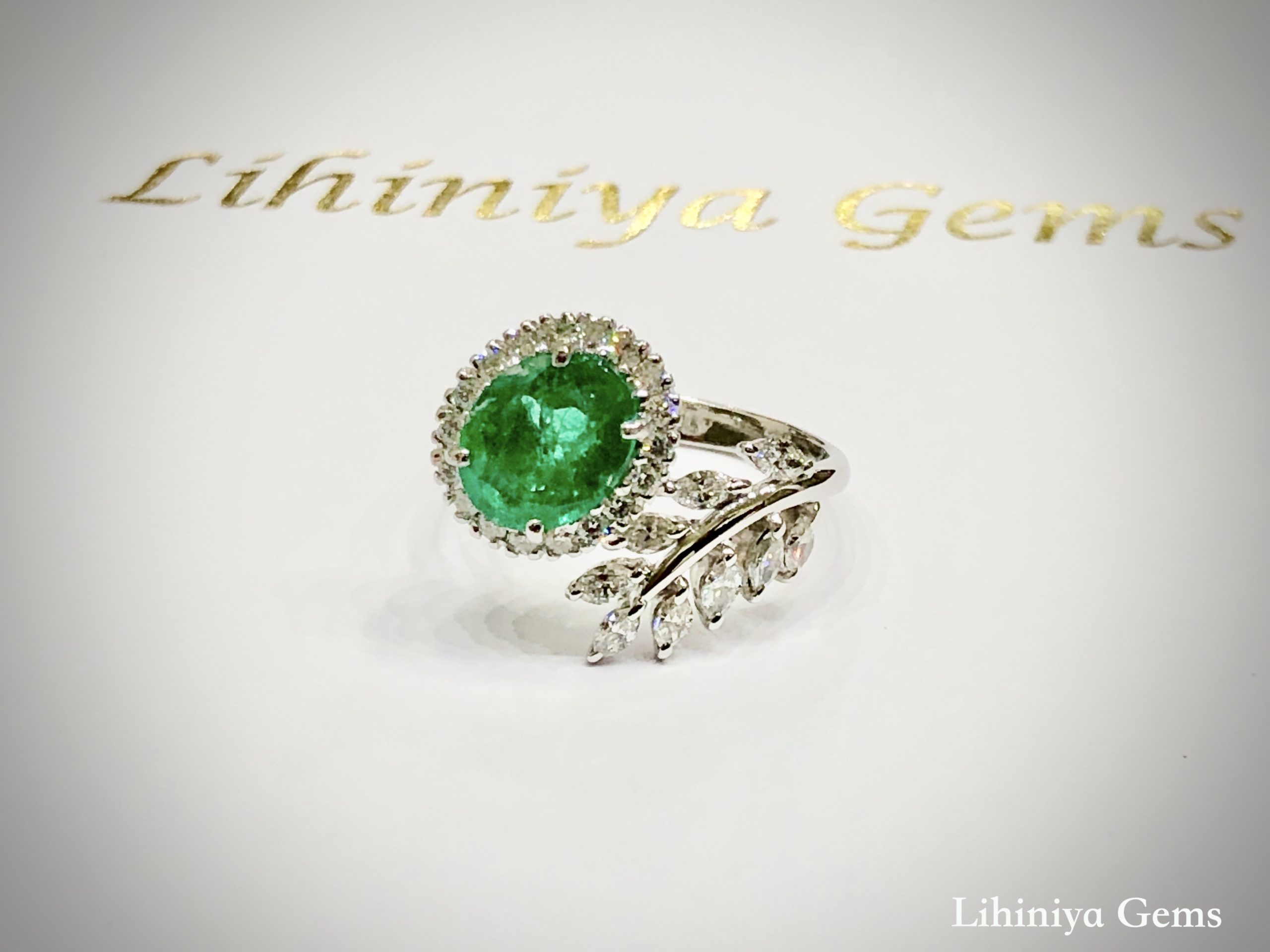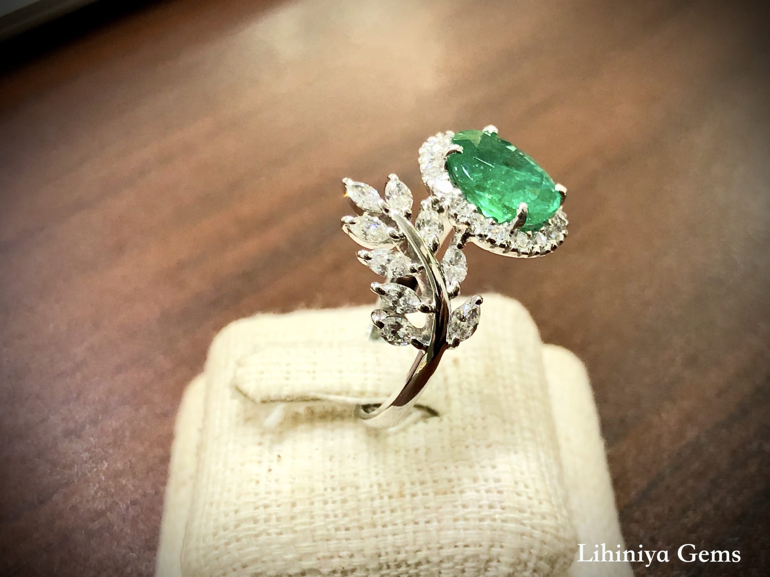The Emerald chosen for its vivid green colour and beauty is set in a “leaf” like diamond setting. The emerald though just over 2 carats has a very good spread, making it look like a much bigger stone when it is set in this ring.