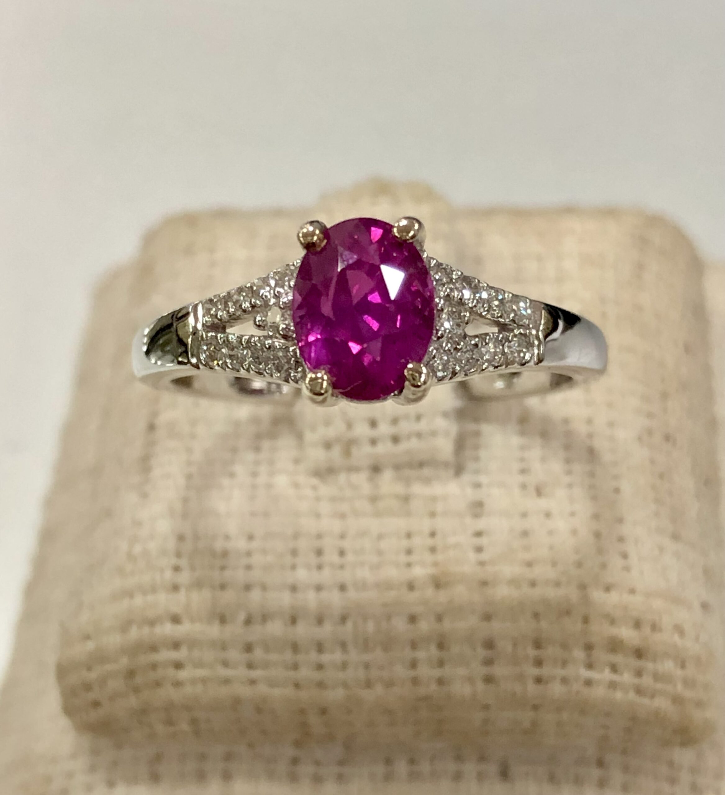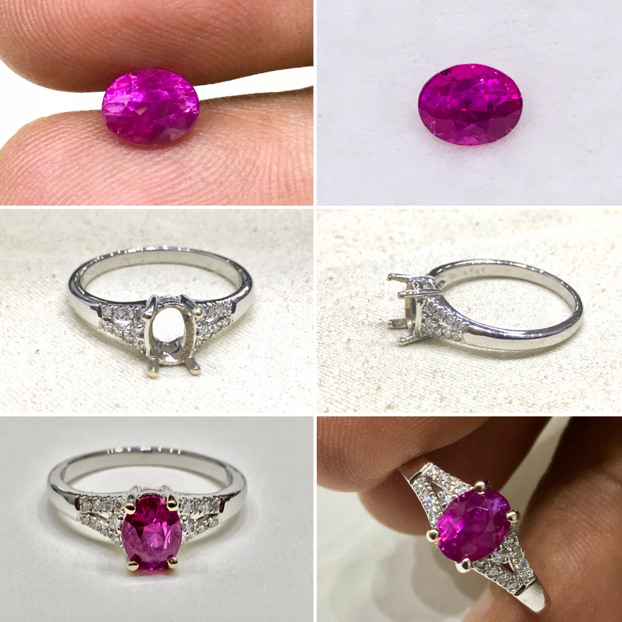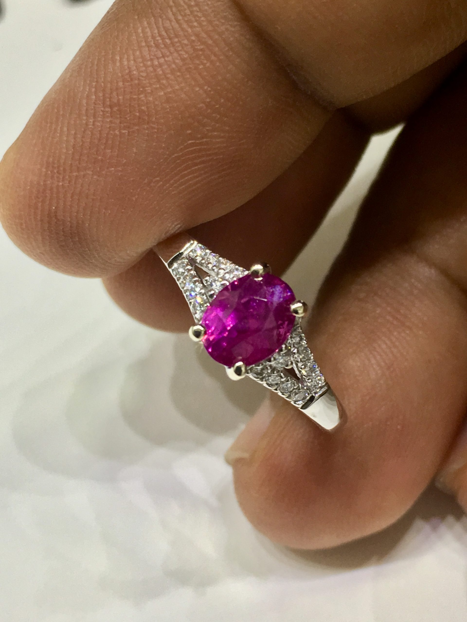Beautiful and almost flawless Pink Sapphire which displays an amazing “Vivid Pink Colour” has been selected for this ring along with high quality natural diamonds.