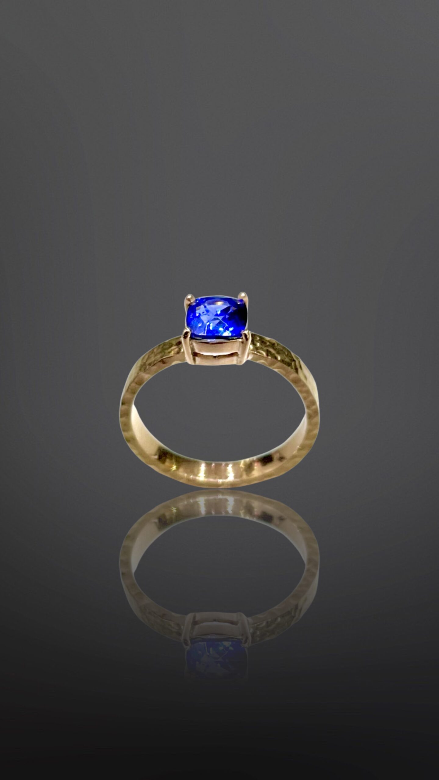This design is a twist on the classic solitaire four prong setting made by giving the band a “hammered effect”