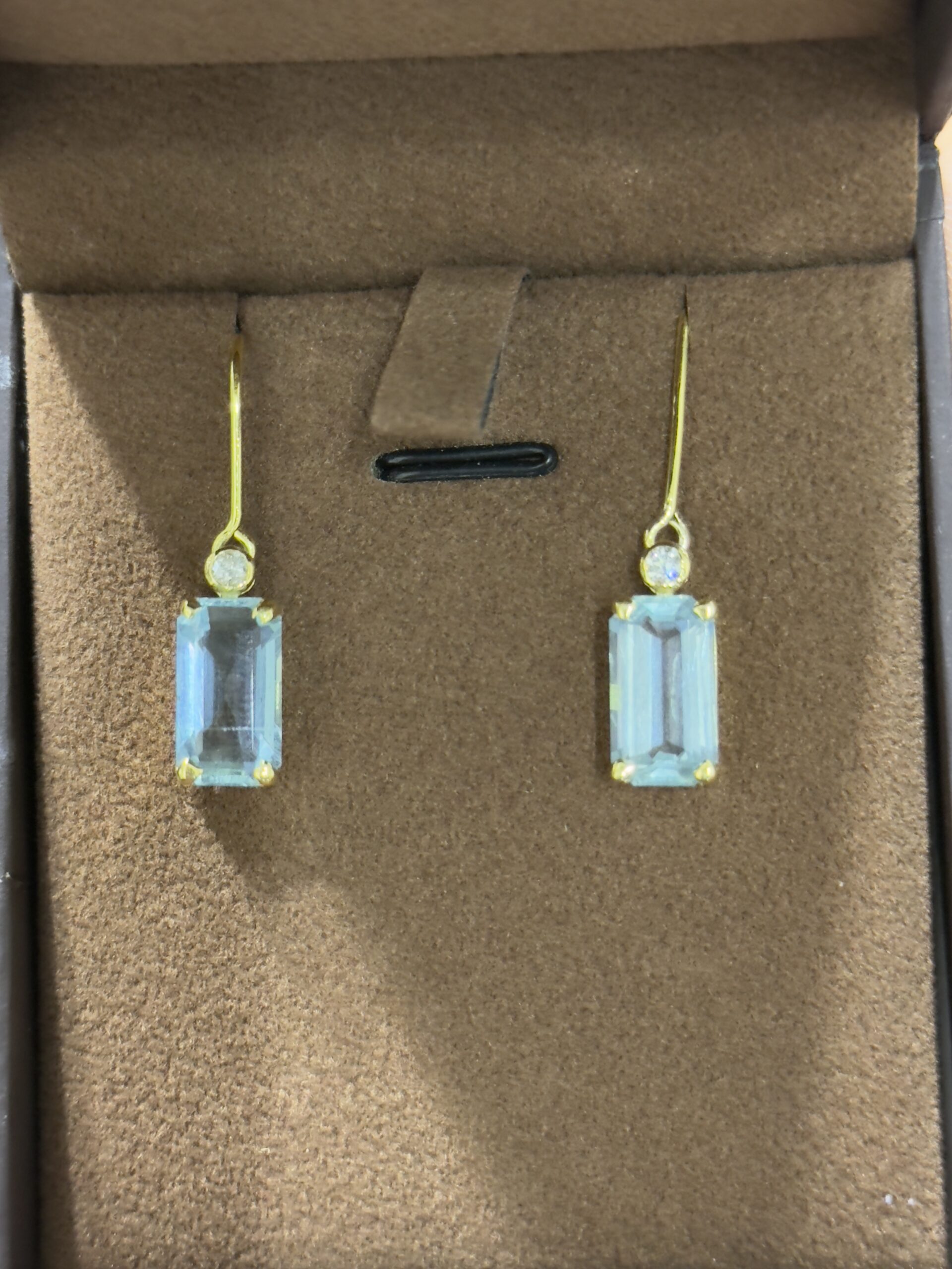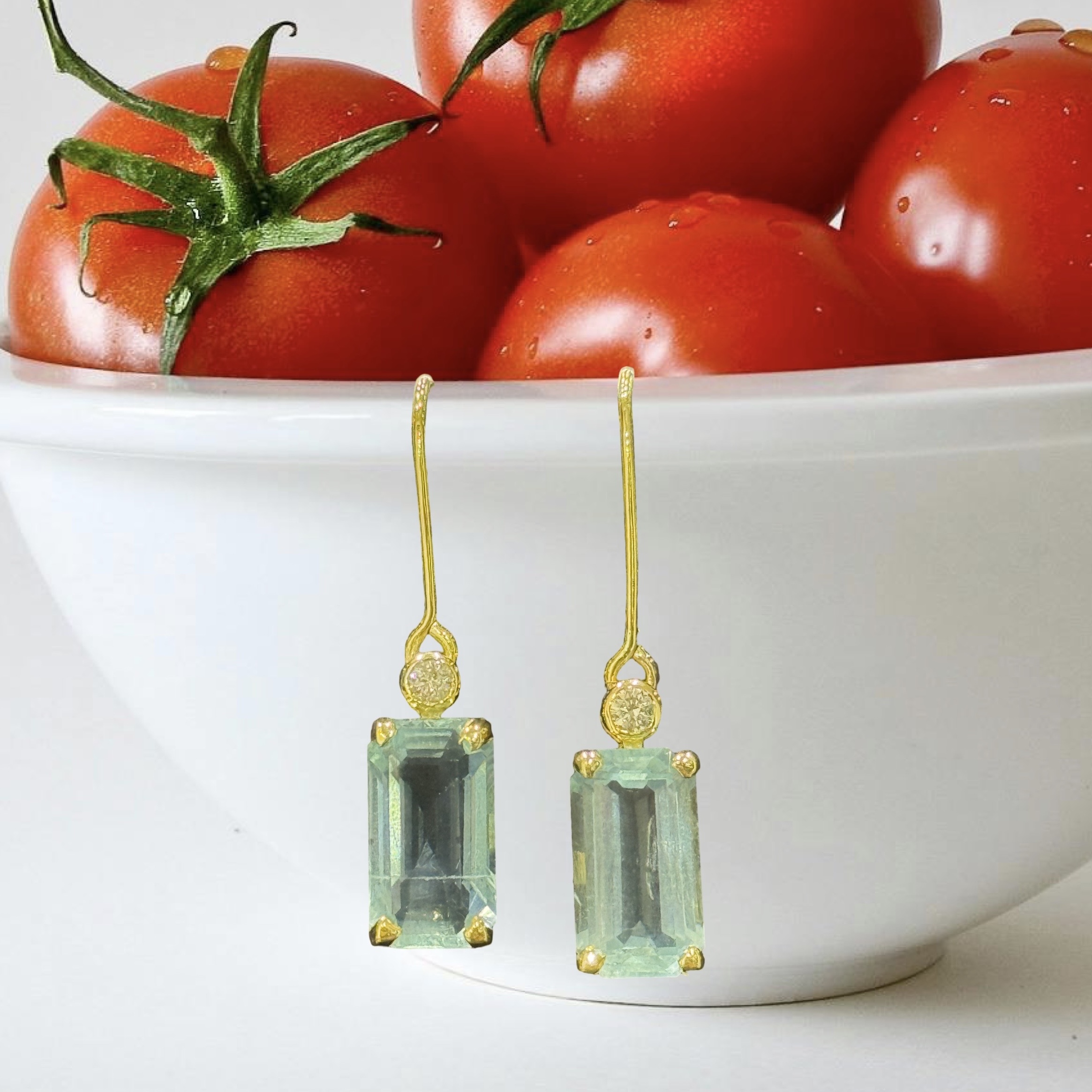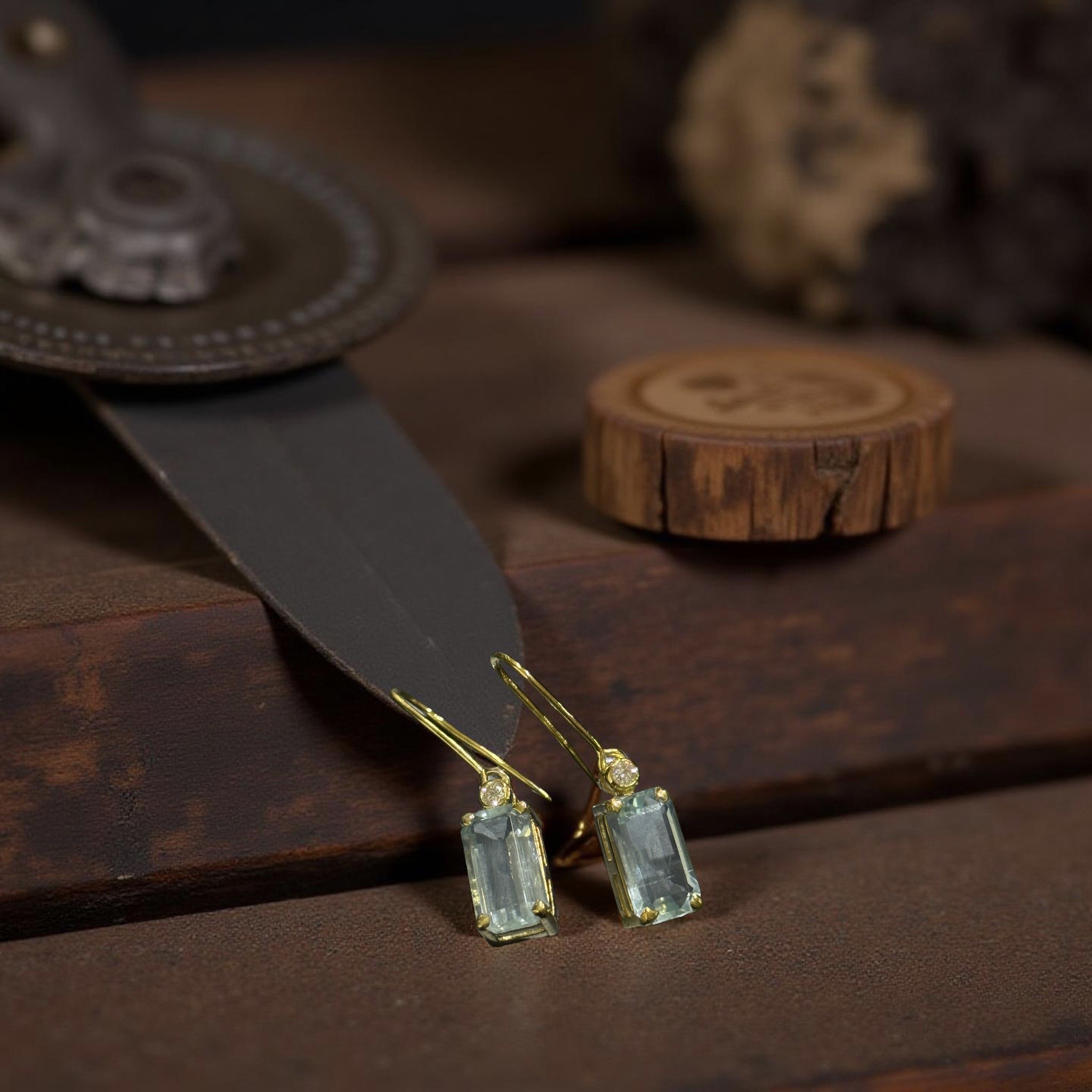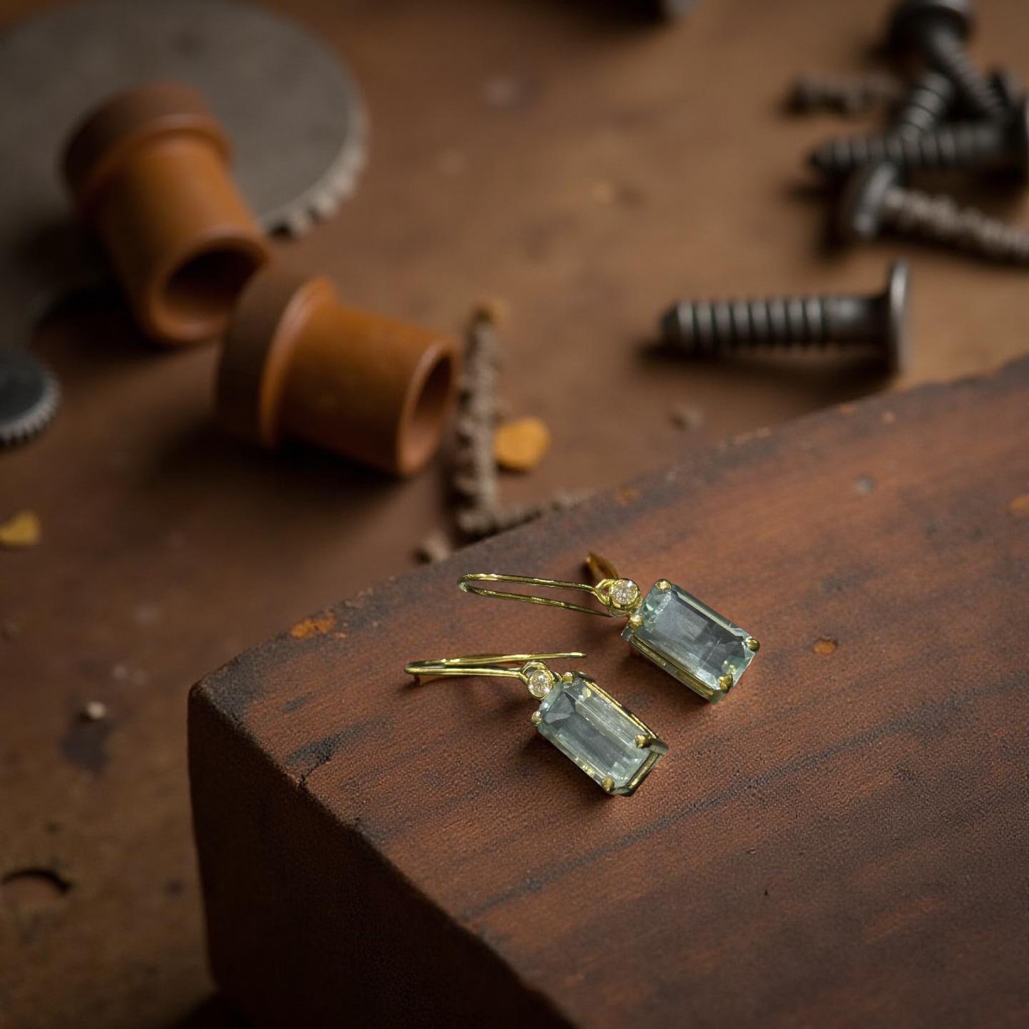 Embrace an effortless elegance with these stunning handmade earrings. Featuring crisp, emerald-cut aquamarines set in luminous yellow gold, each earring is accented with a single sparkling diamond for a touch of timeless sophistication. The perfect whisper of serene colour for any occasion