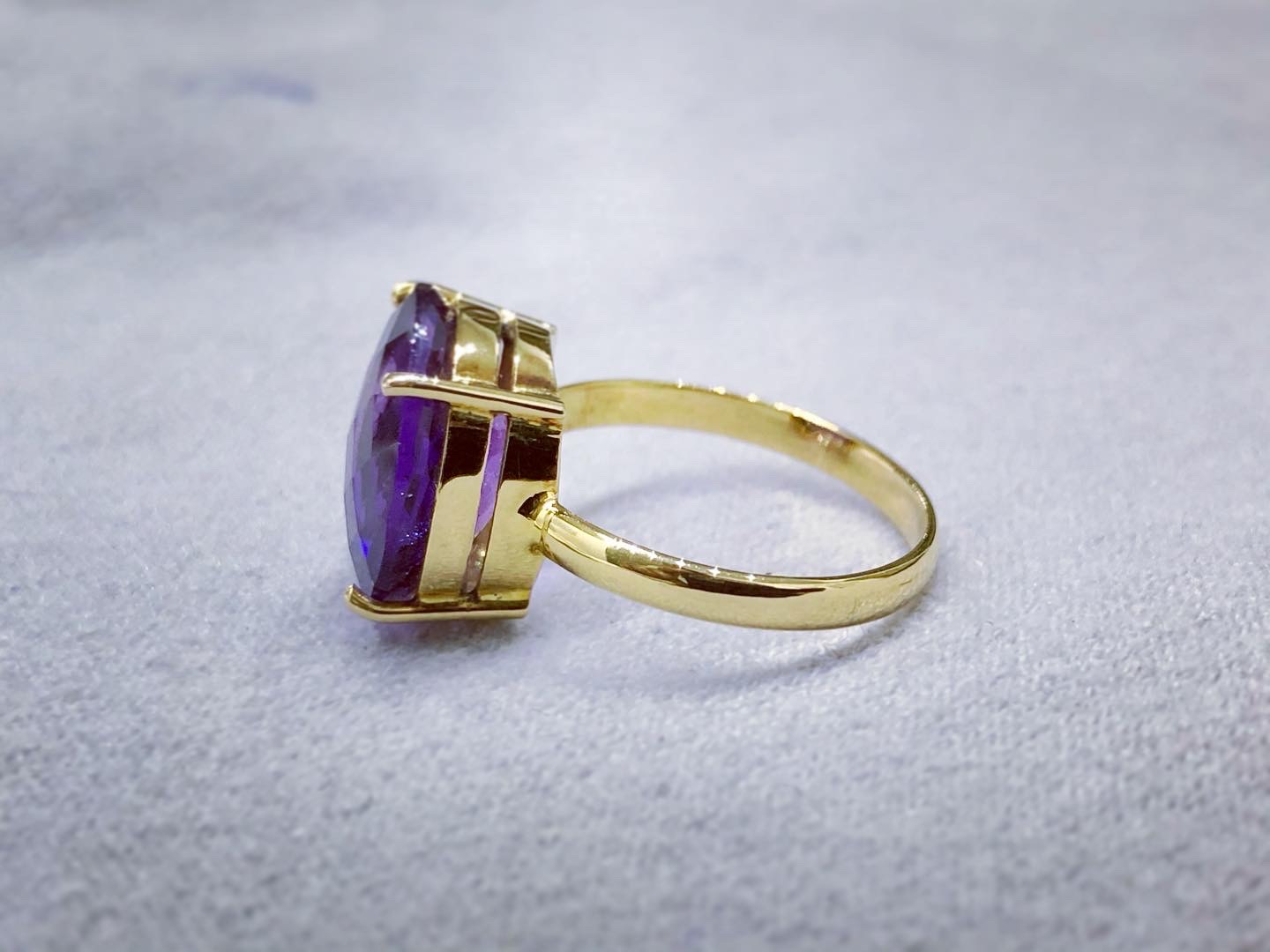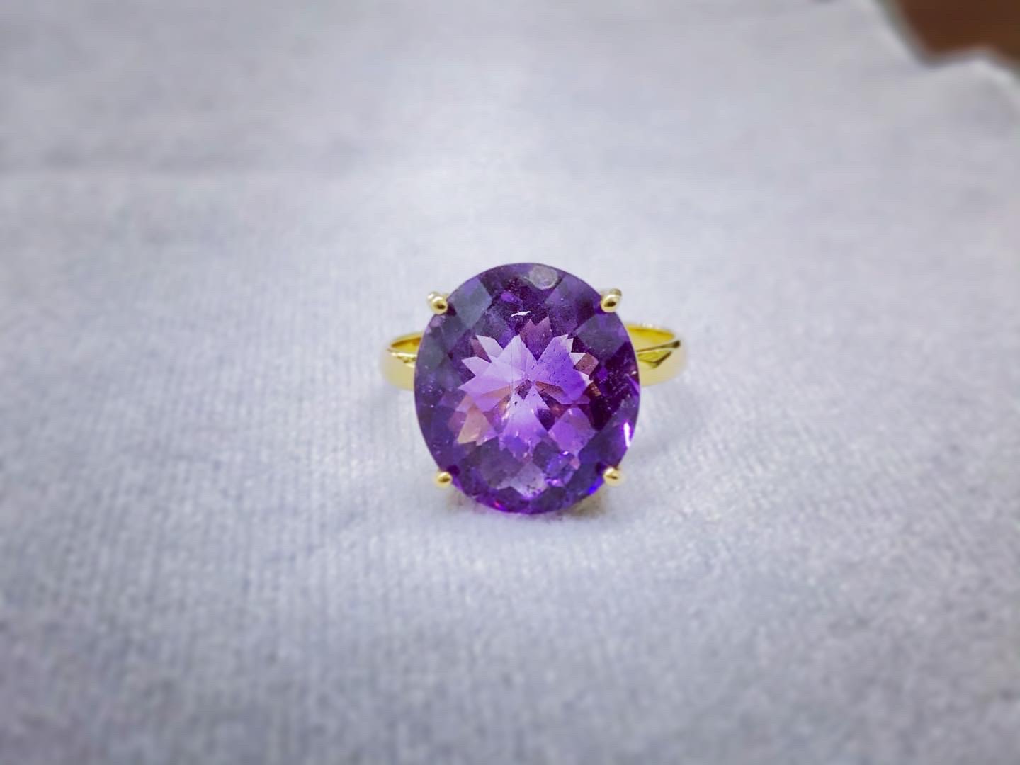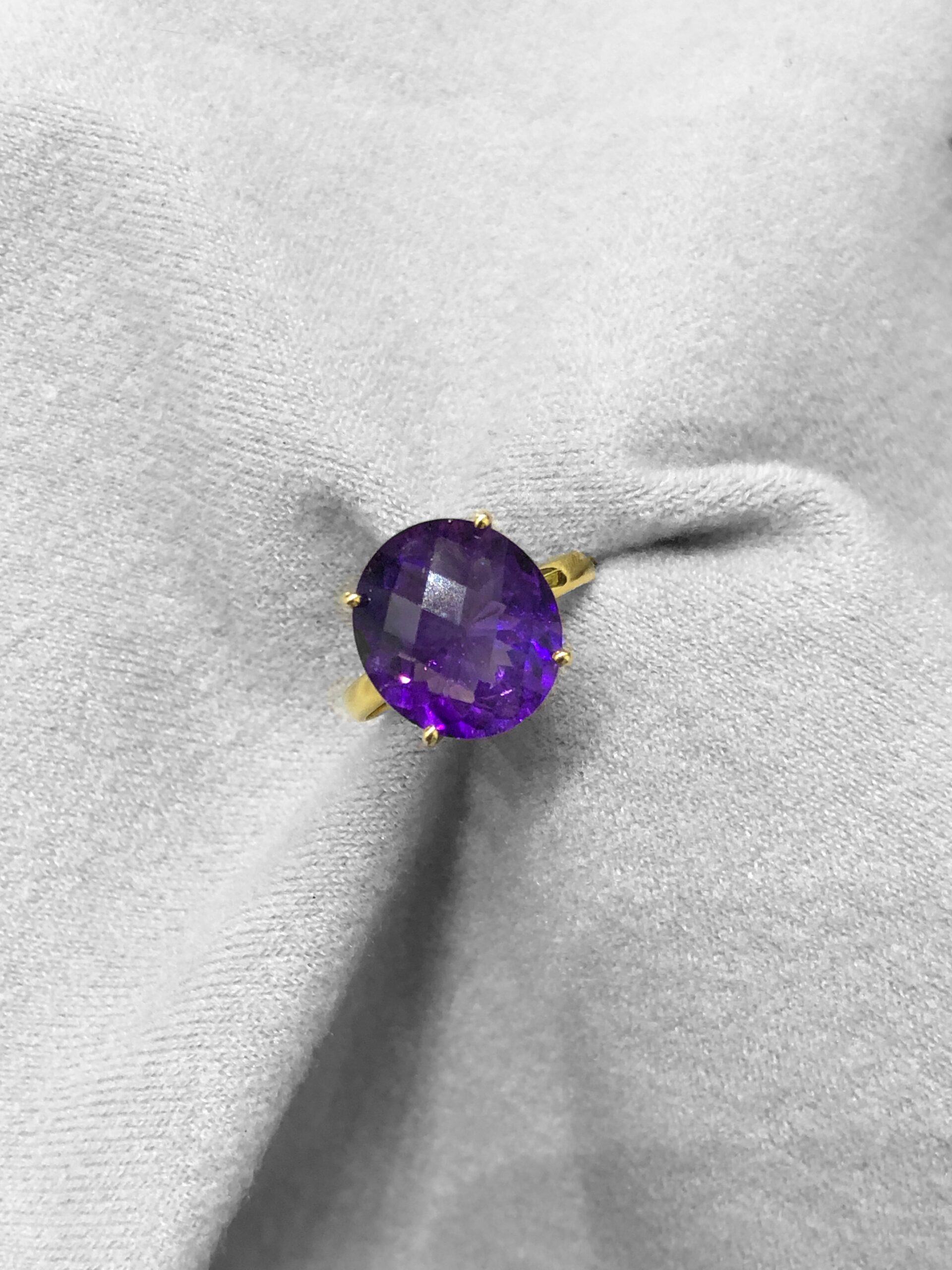 Beautiful and vibrant purple colour Natural Amethyst set in a classic 4 prong setting. This ring will always capture the audience with its bold and vibrant personality!