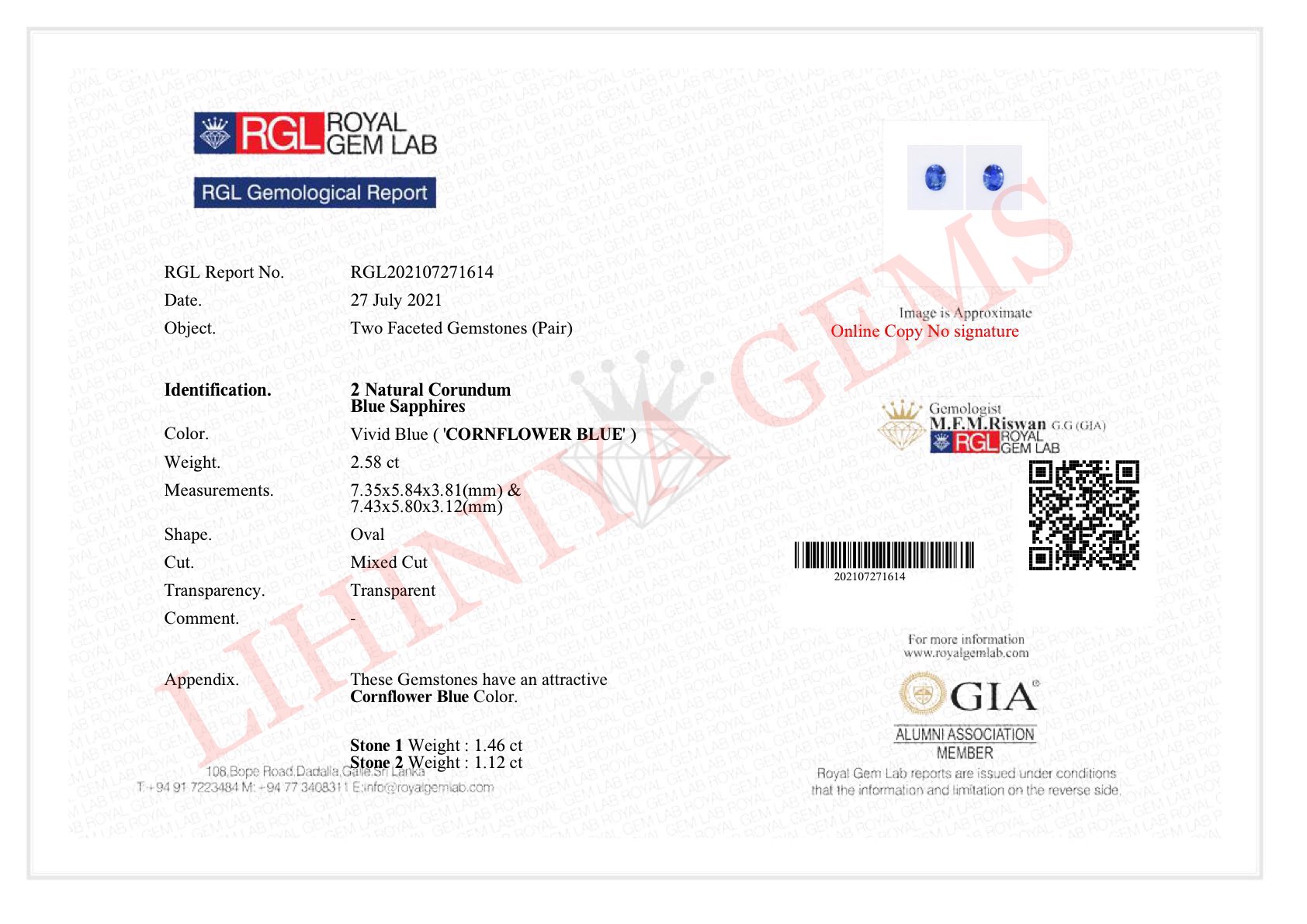 - Weight: 2.58ctw total (1.12cts + 1.46cts)
