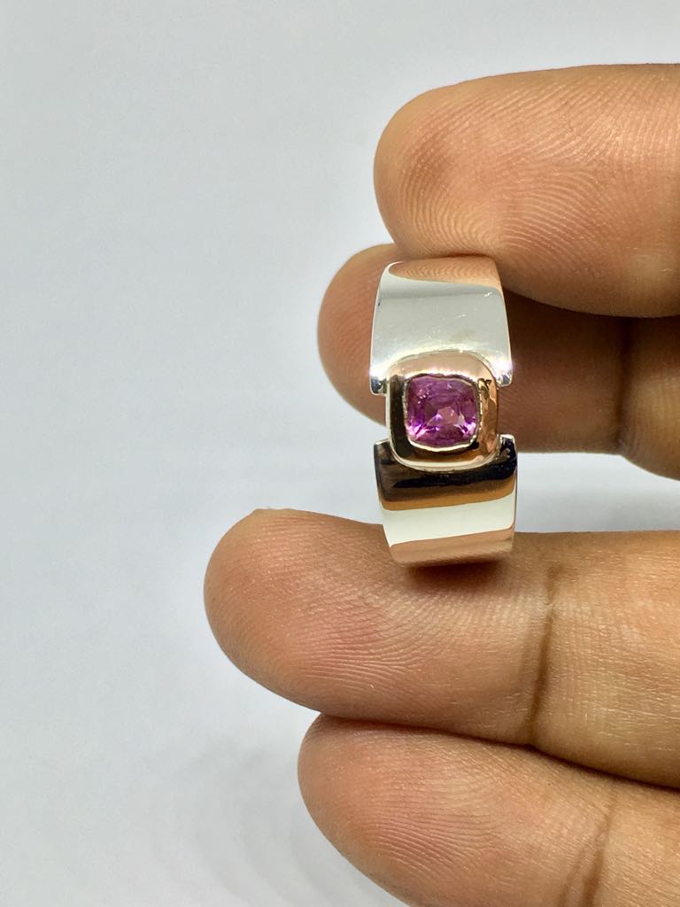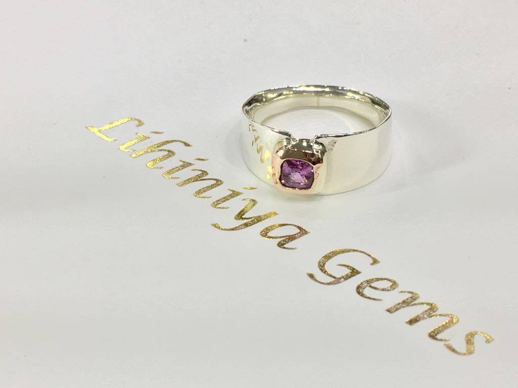 Beautiful Natural Pink Sapphire set in Sterling Silver and 9kt solid Gold soldered (NOT PLATED) around the stone for a rich finish.
