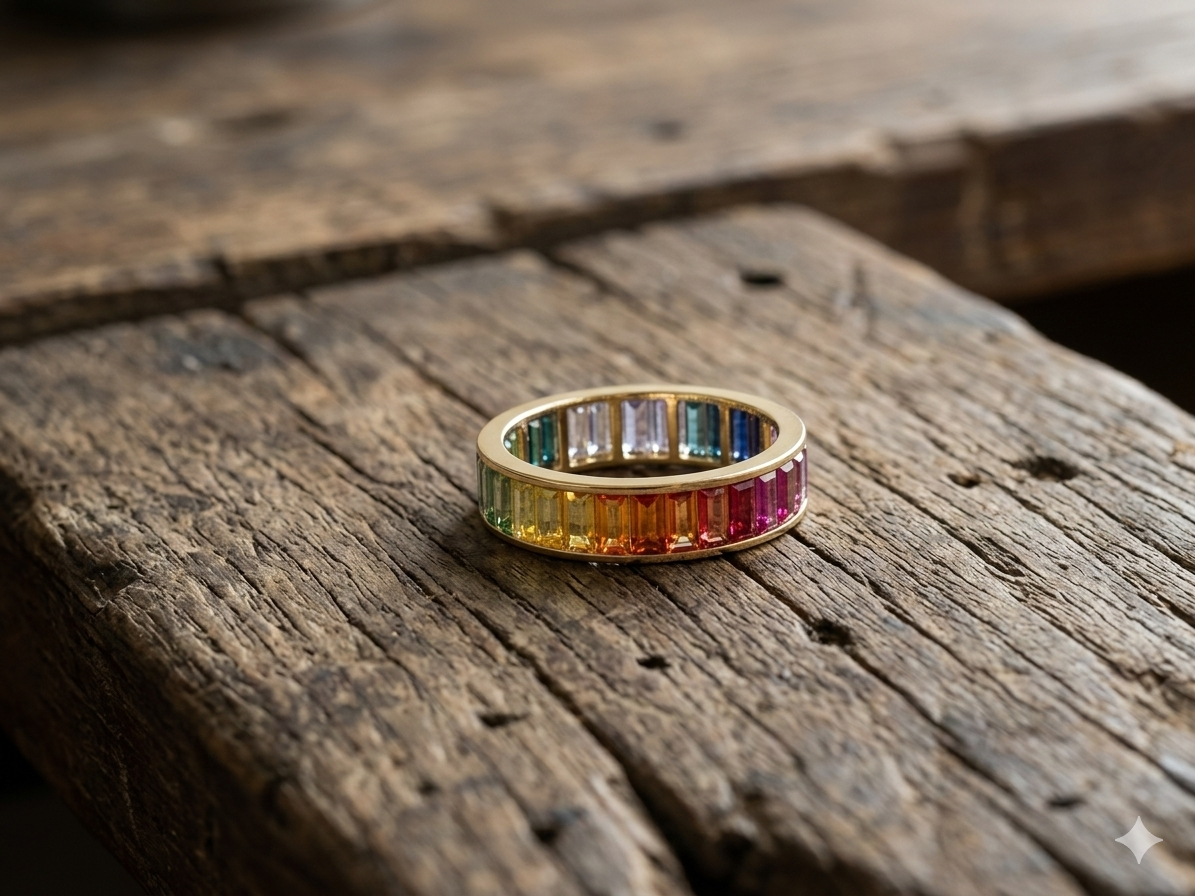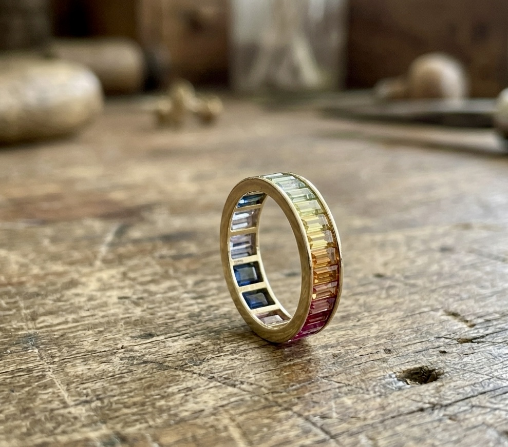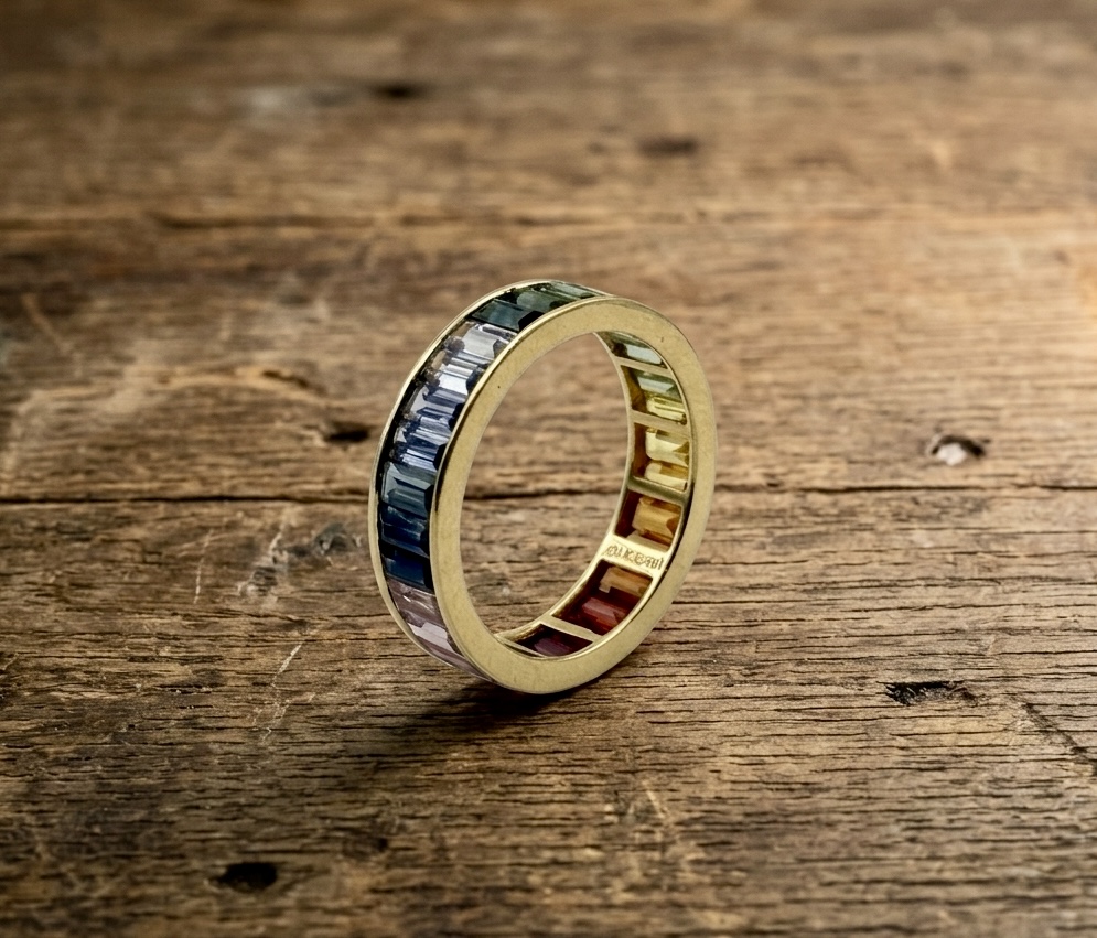 Embrace the full spectrum of light with this breathtaking eternity band, a vibrant celebration of colour and craftsmanship. Expertly cast in radiant 18kt yellow gold, this ring features a continuous sequence of baguette-cut multi-coloured sapphires, meticulously arranged to create a seamless rainbow gradient.