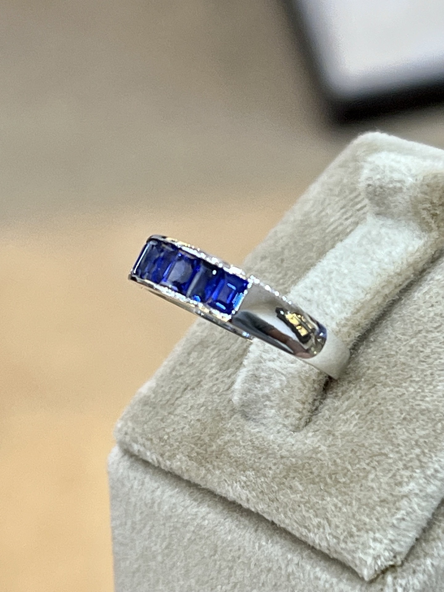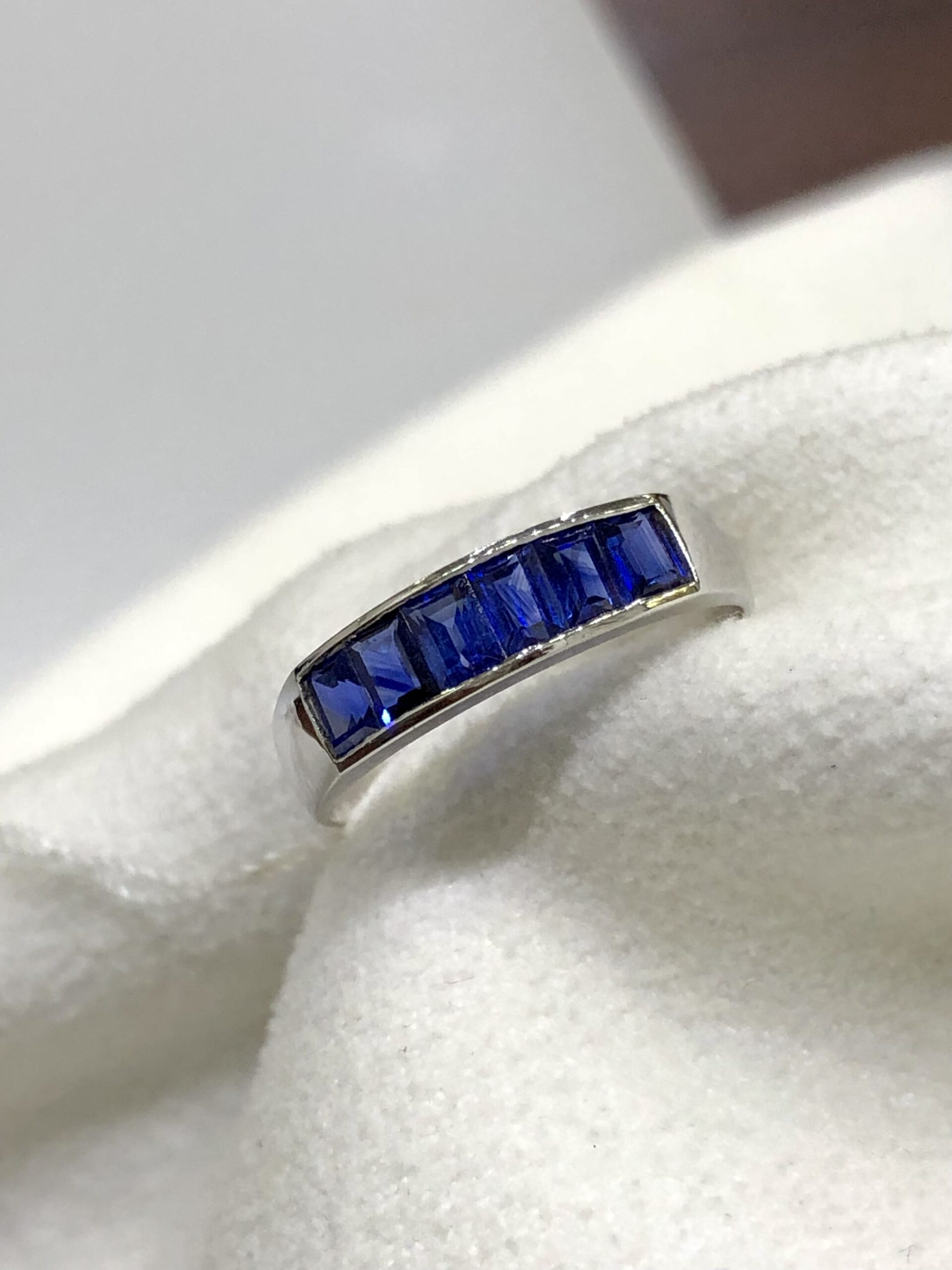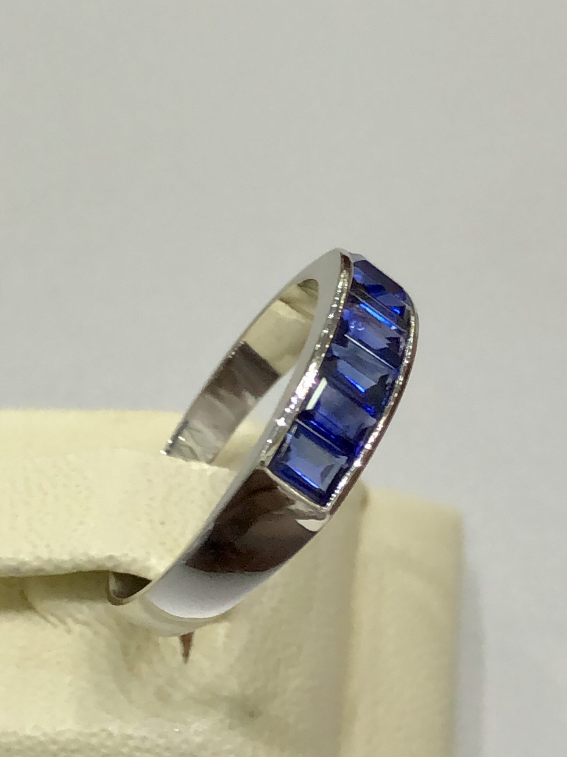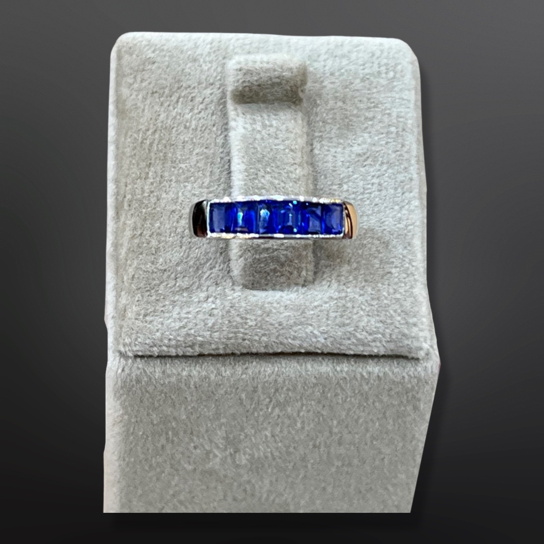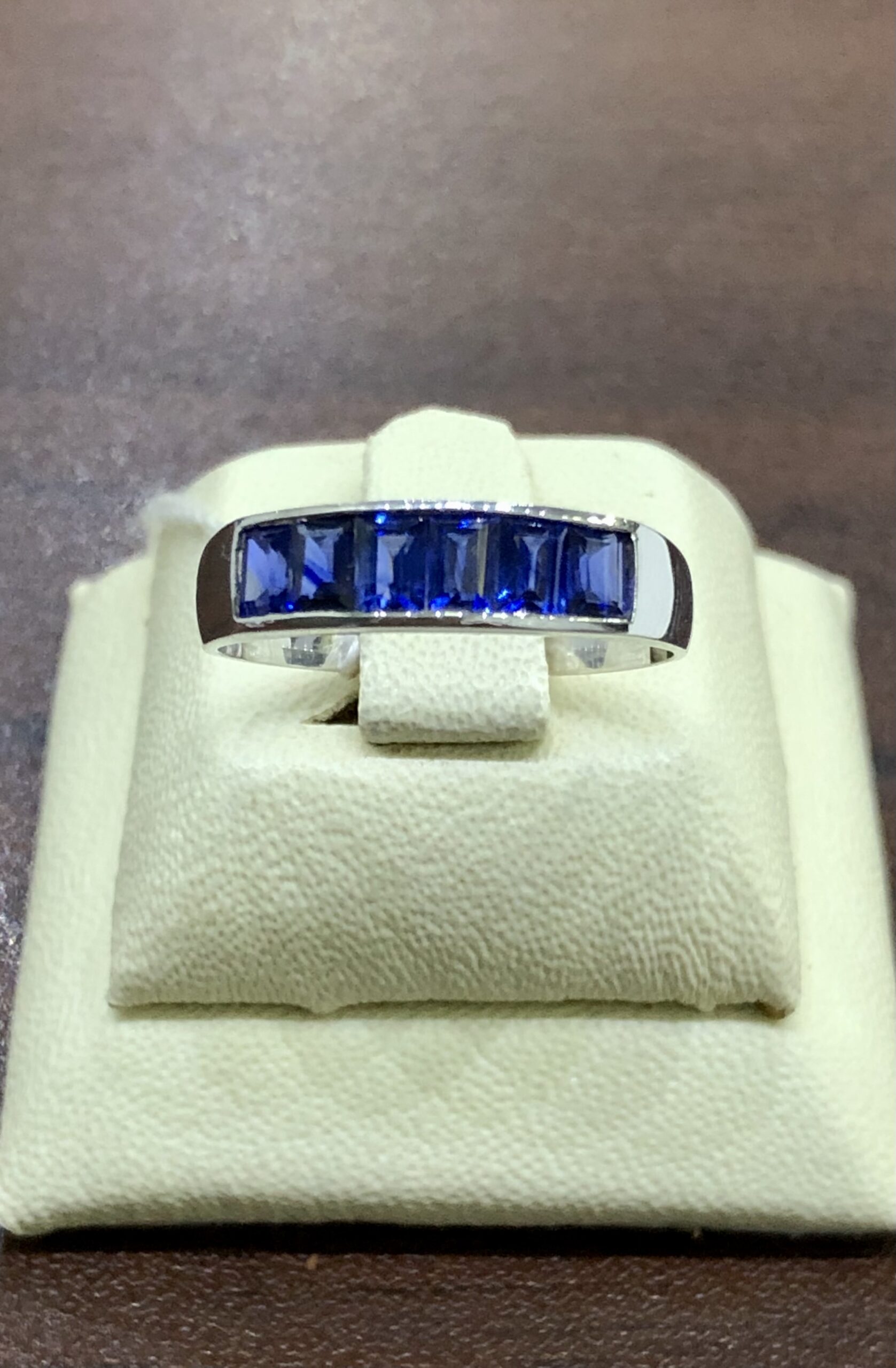 Modern and symmetrical, this ring is set with 6 beautiful and well saturated Royal Blue Sapphires. All handmade in Galle, Sri Lanka