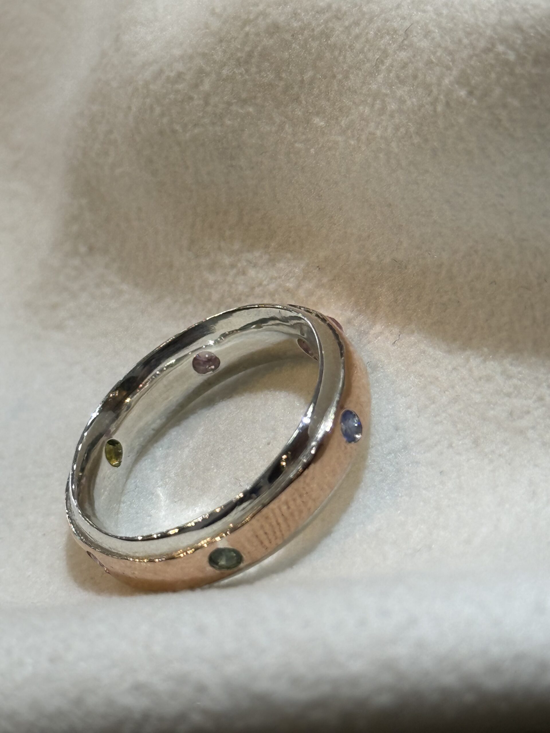 Celebrate everlasting style with this exquisite sterling silver and 9-carat gold sapphire eternity ring. Handcrafted with meticulous attention to detail, this unique ring features a delicate band of sterling silver accented by a fine, solid 9ct gold trim expertly soldered to the edges. Set within this refined design are beautiful, ethically sourced multi coloured sapphires, each carefully secured to enhance the gemstones’ sparkle.