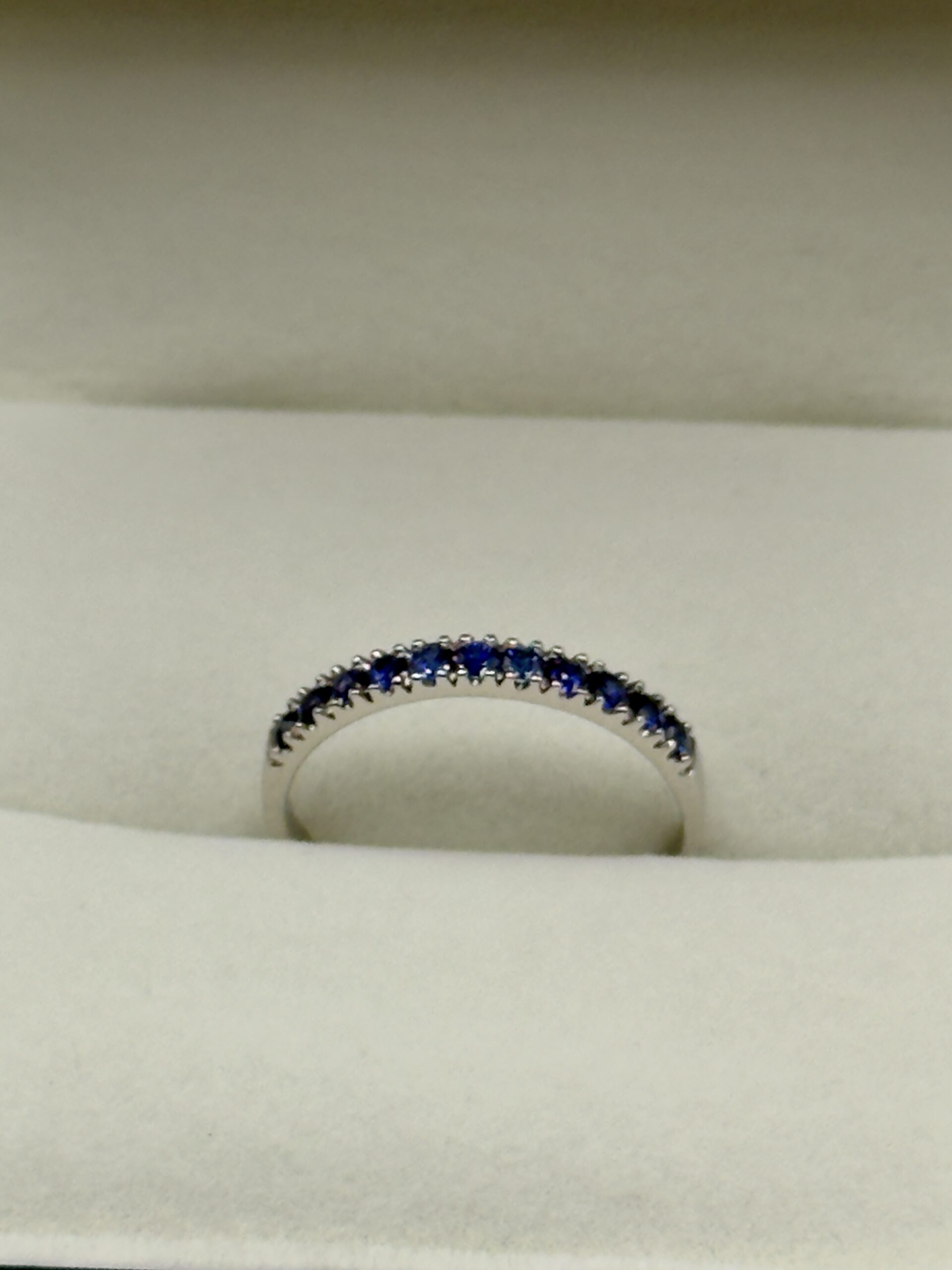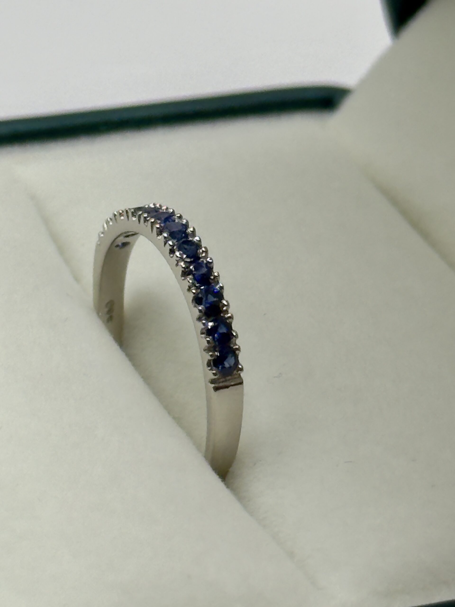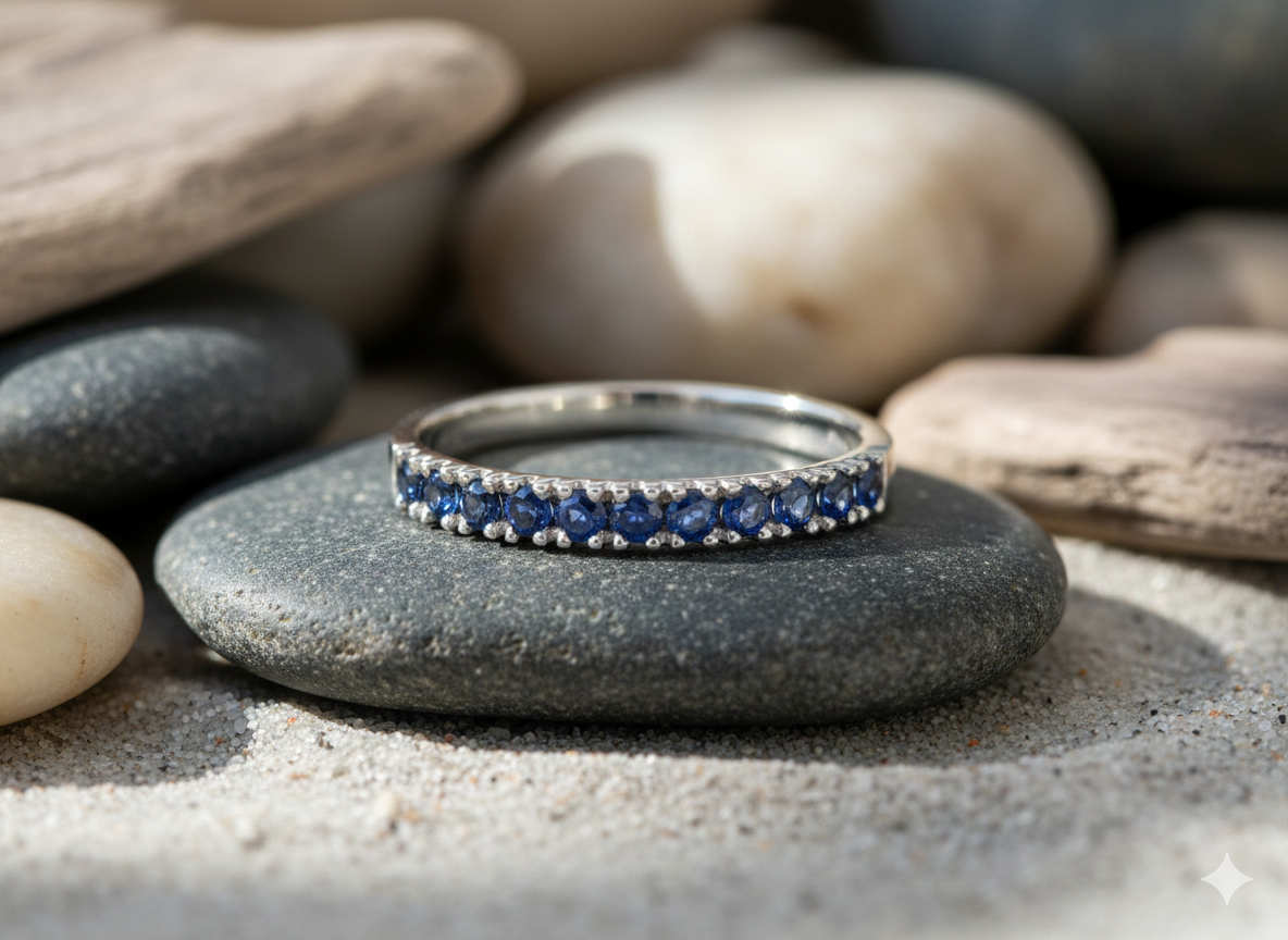 The band features a meticulous row of vibrant blue sapphires, totalling 0.40cts. Each stone is held in a classic pavé-inspired setting, ensuring maximum light exposure and a smooth, comfortable finish. The cool undertones of the white gold perfectly complement the deep, velvet hues of the gemstones, creating a striking contrast that feels both organic and high-end.