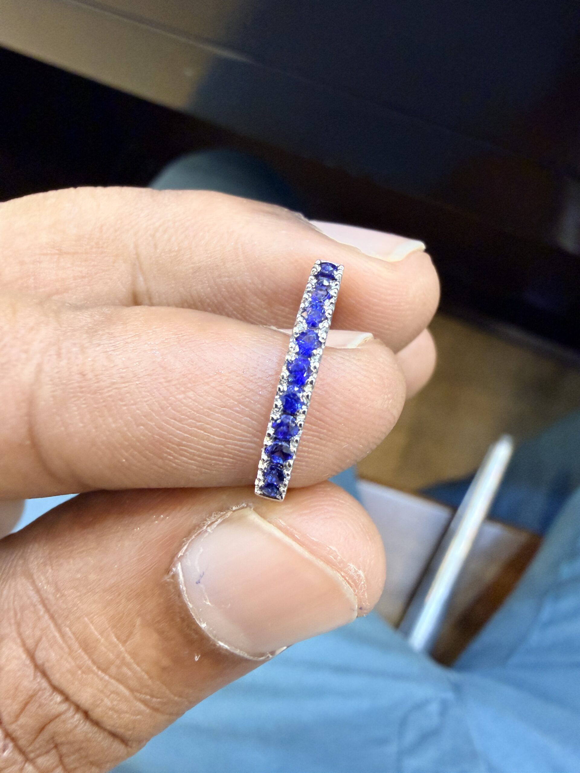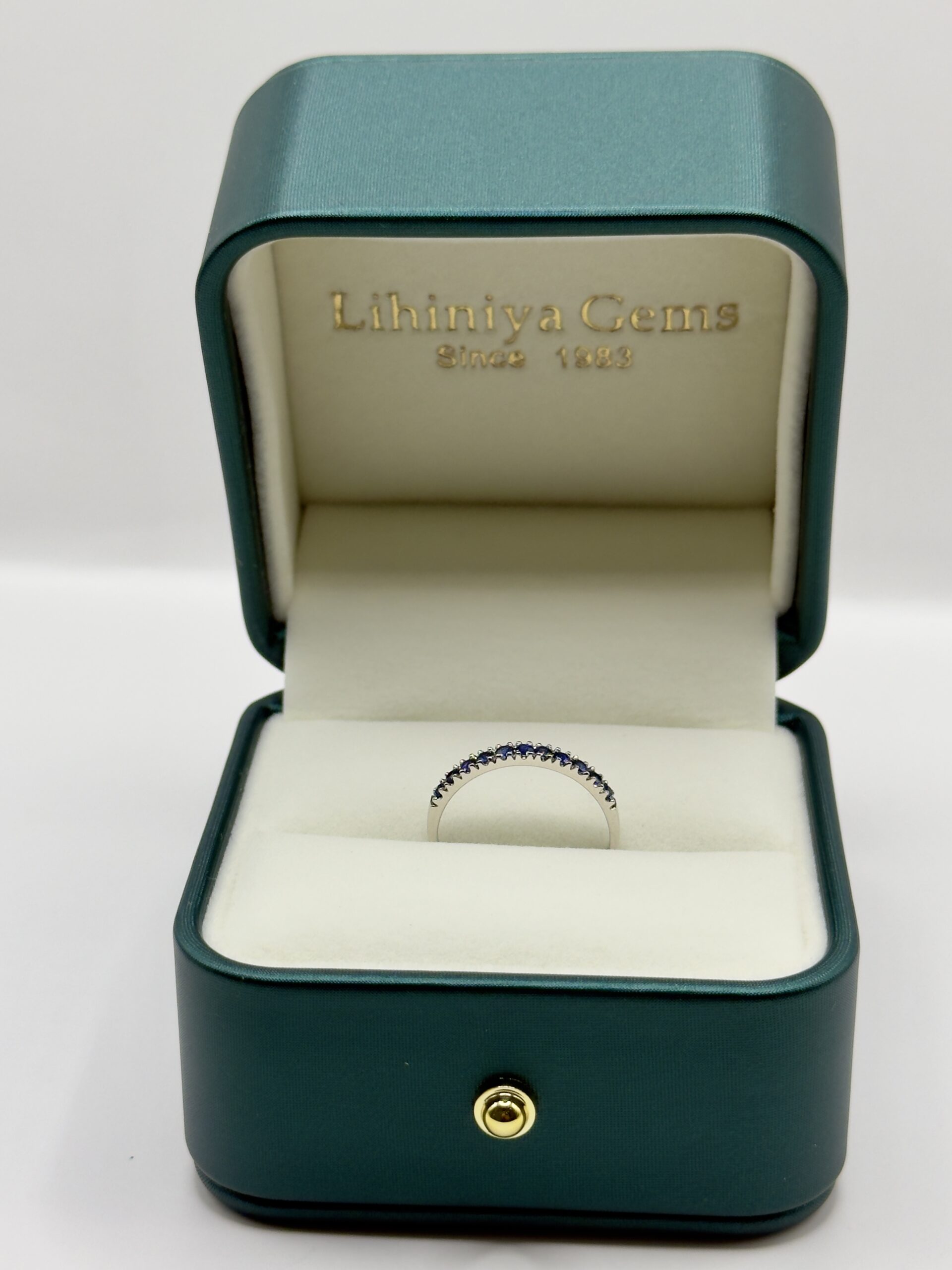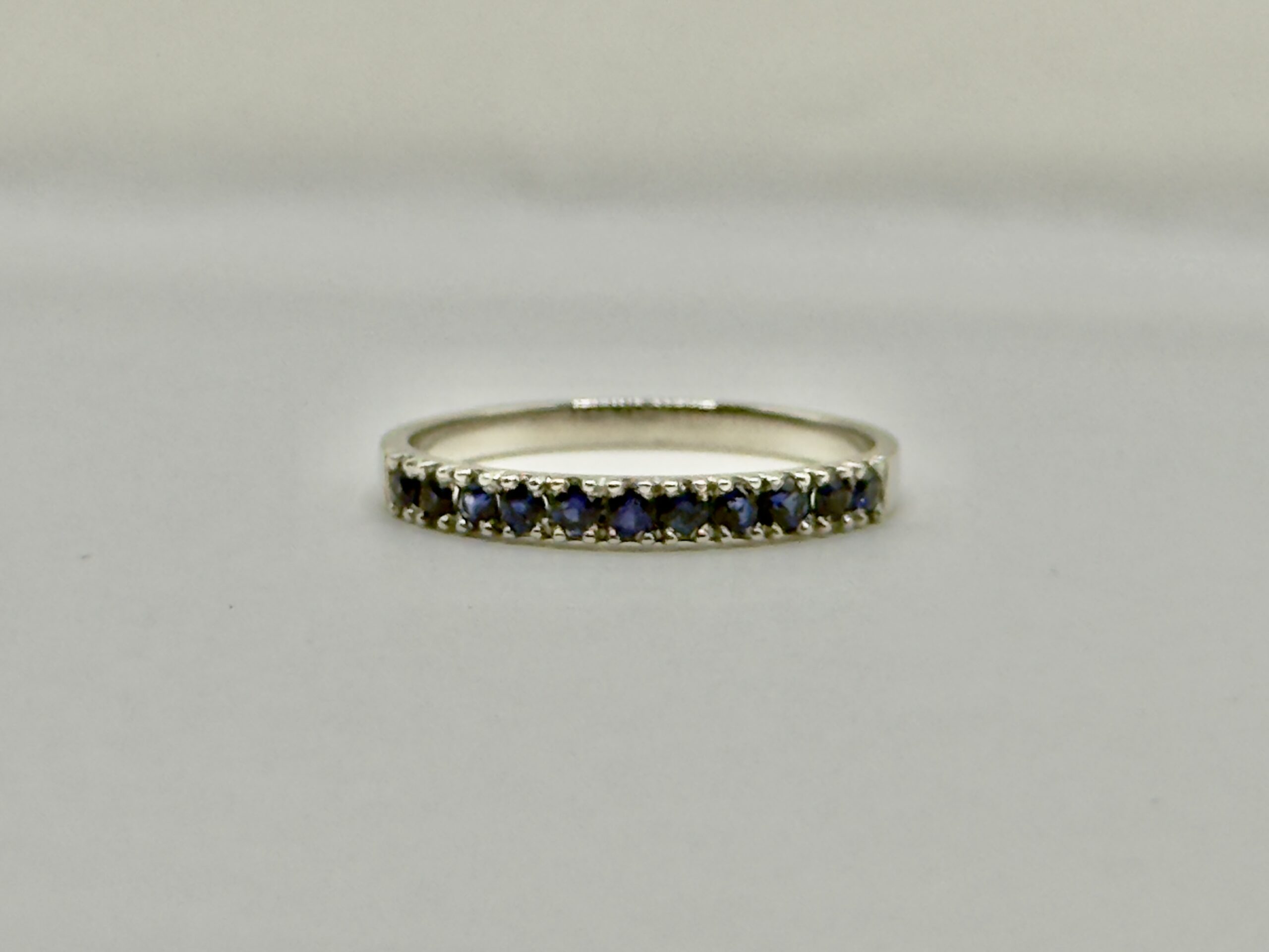 The band features a meticulous row of vibrant blue sapphires, totalling 0.40cts. Each stone is held in a classic pavé-inspired setting, ensuring maximum light exposure and a smooth, comfortable finish. The cool undertones of the white gold perfectly complement the deep, velvet hues of the gemstones, creating a striking contrast that feels both organic and high-end.