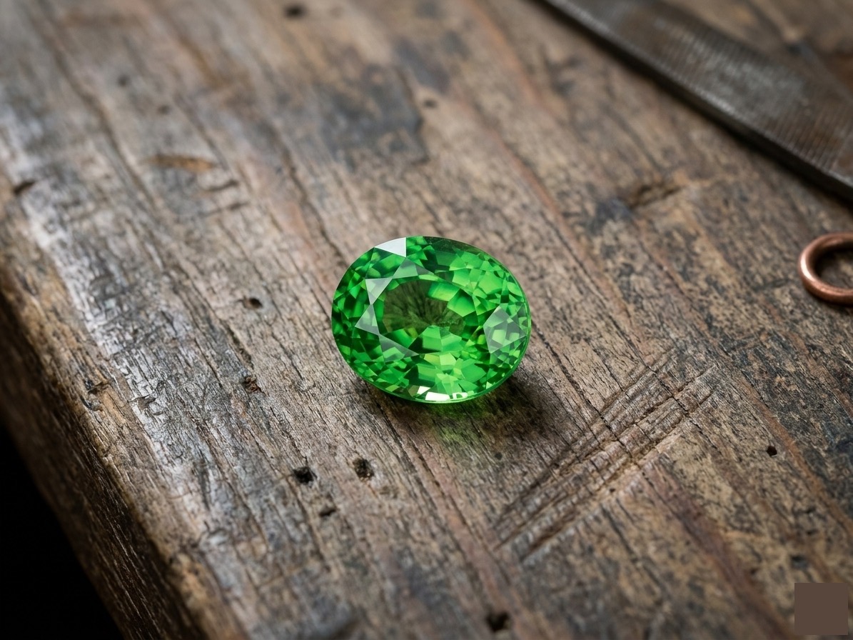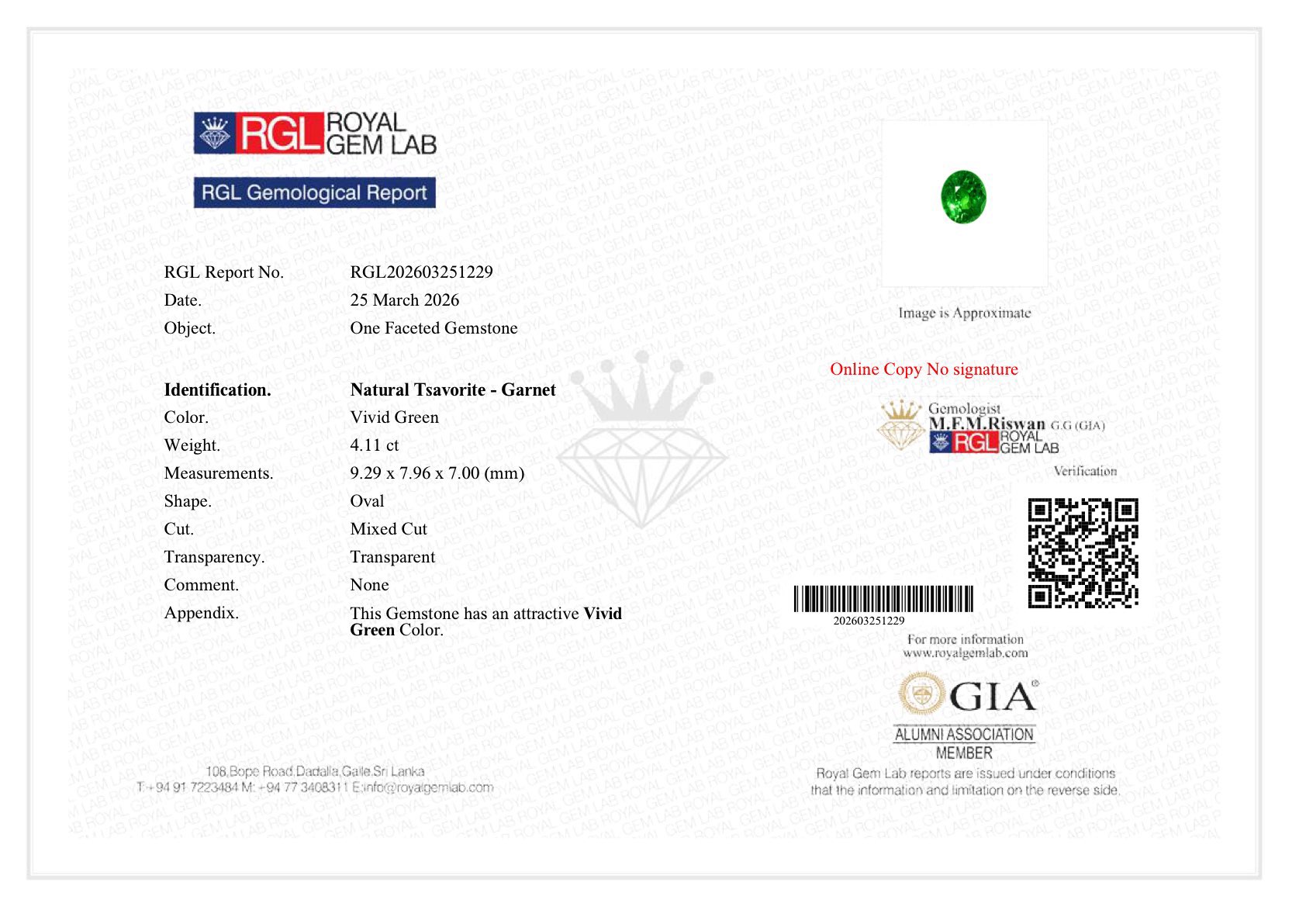 Behold the breathtaking brilliance of a true forest treasure. This exceptional Natural Tsavorite Garnet captivates with its intense, Vivid Green hue, a colour so vibrant it rivals the finest emeralds. Weighing a significant 4.11 carats, this gemstone is a rare find of remarkable size and superior quality.