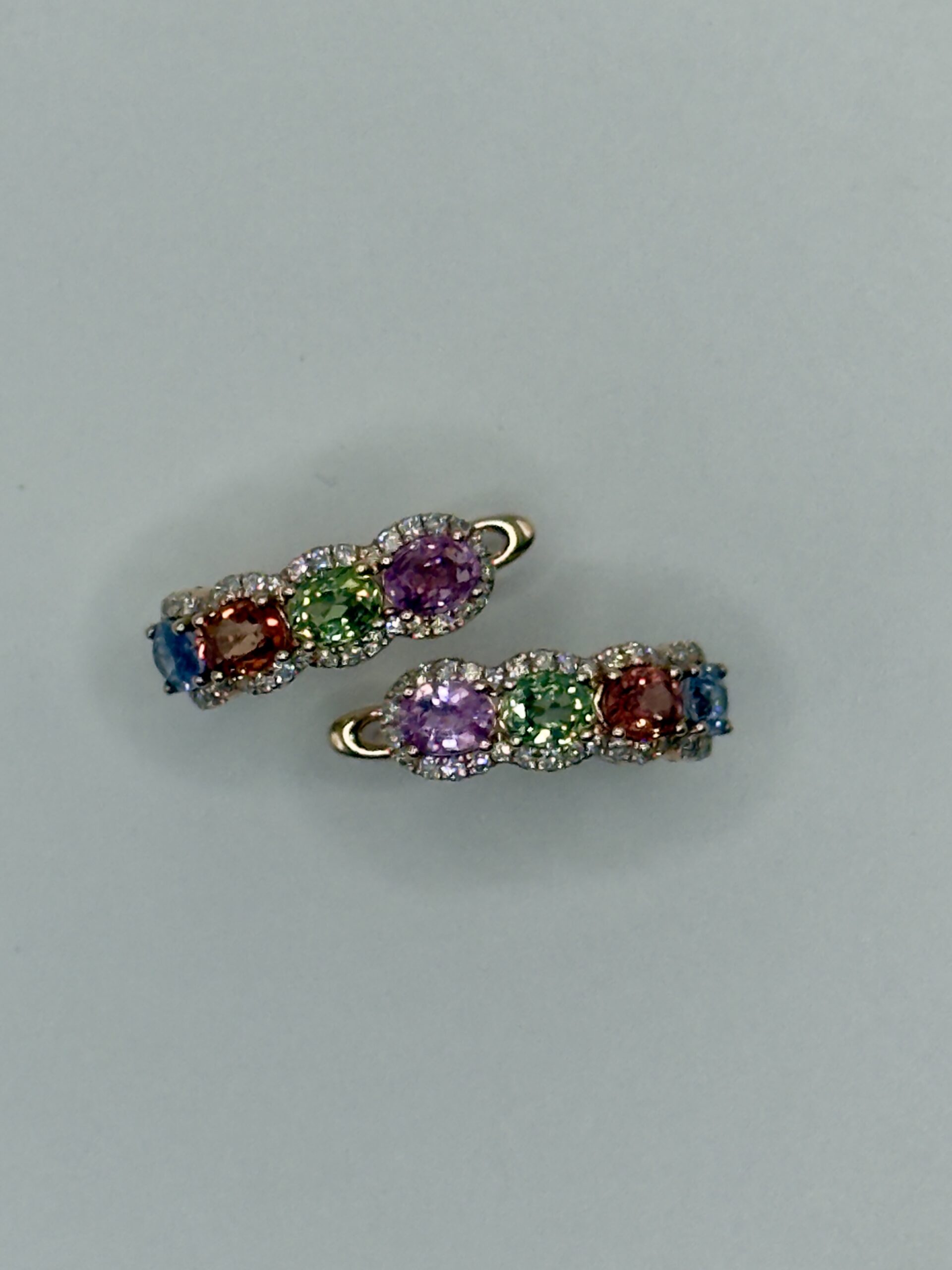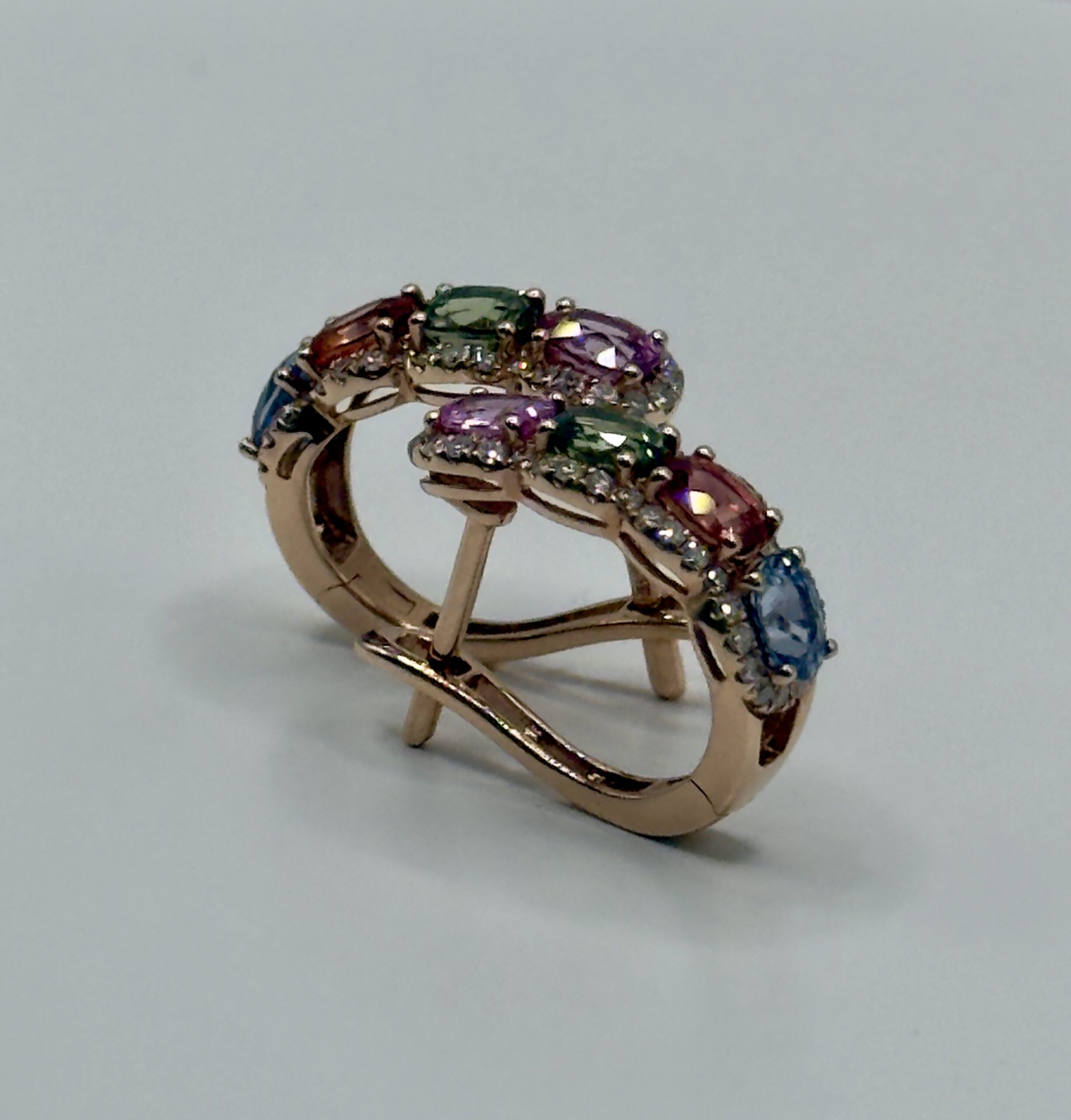 Each central gemstone is encased in a delicate halo of 0.28cts round brilliant diamonds, selected for their exceptional G-H colour and VS-SI clarity. Set in rich 14kt rose gold, the warm metal tones enhance the brilliance of the stones, creating a luxurious and playful accessory perfect for adding a sophisticated splash of colour to any ensemble.