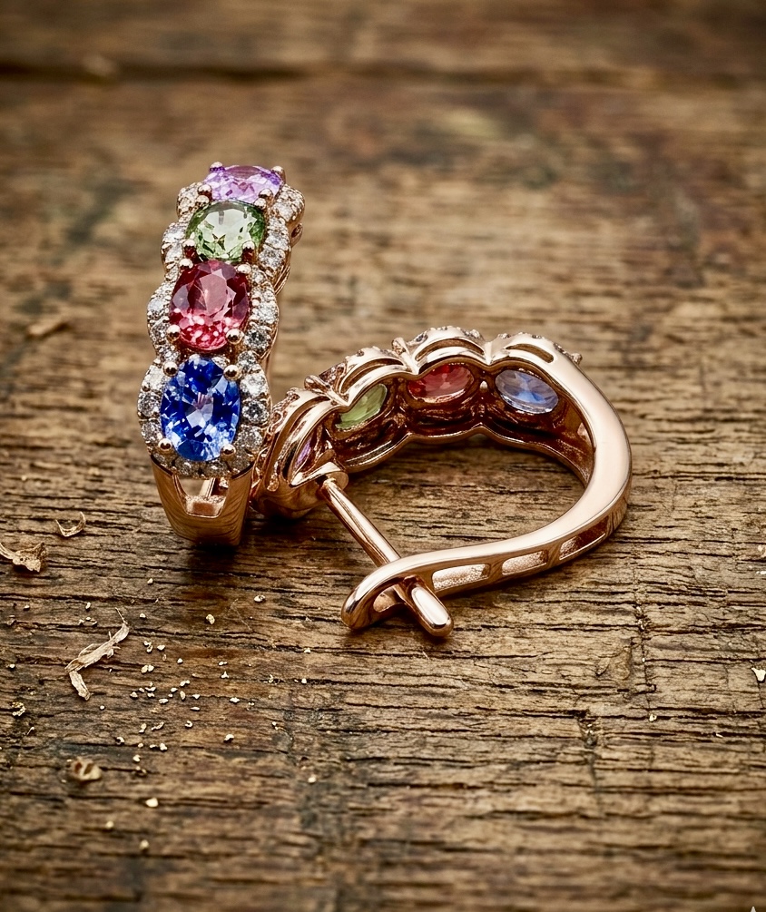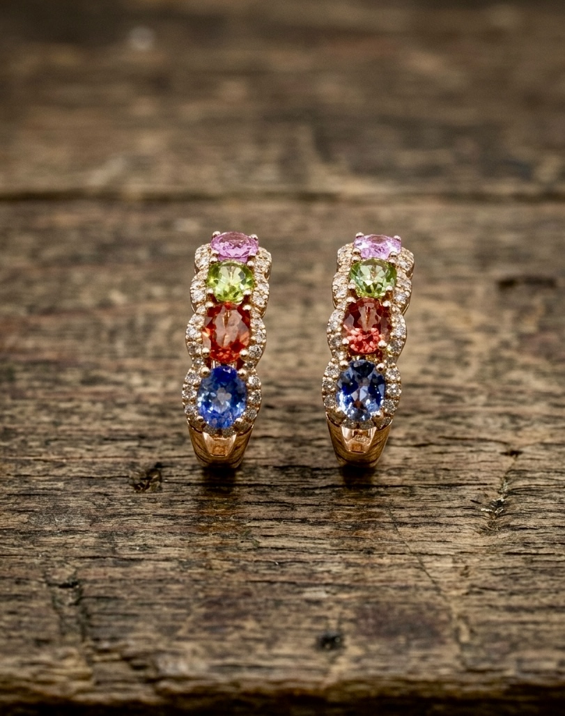 Capture the full beauty of the rainbow with these breathtaking multi-stone hoop earrings. Featuring a vibrant vertical pavé of premium sapphires totaling 2.05cts, these earrings showcase a stunning transition of colours—from deep royal blue and warm orange to vivid lime and soft pink.